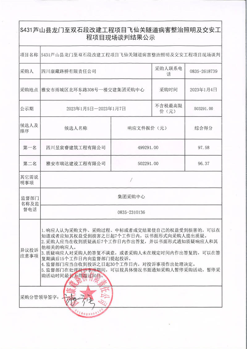 四川康藏路橋有限責任公司S431蘆山縣龍門至雙石段改建工程項目飛仙關隧道病害整治照明及交安工程項目現場談判結果公示
