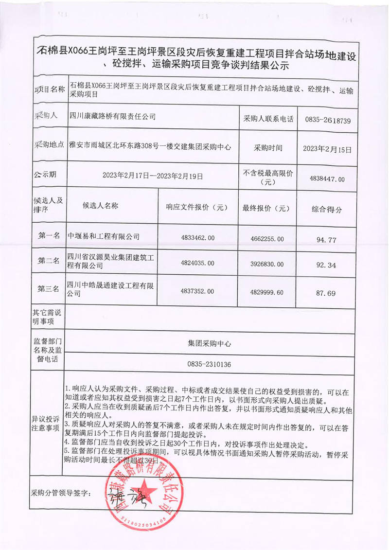 四川康藏路橋有限責(zé)任公司石棉縣X066王崗坪至王崗坪景區(qū)段災(zāi)后恢復(fù)重建工程項(xiàng)目拌合站場地建設(shè)、砼攪拌、運(yùn)輸采購項(xiàng)目競爭談判結(jié)果公示