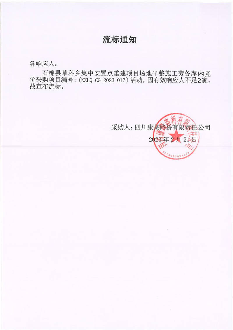 四川康藏路橋有限責(zé)任公司石棉草科鄉(xiāng)集中安置點重建項目場地平整施工勞務(wù)庫內(nèi)施工勞務(wù)庫內(nèi)采購流標(biāo)通知