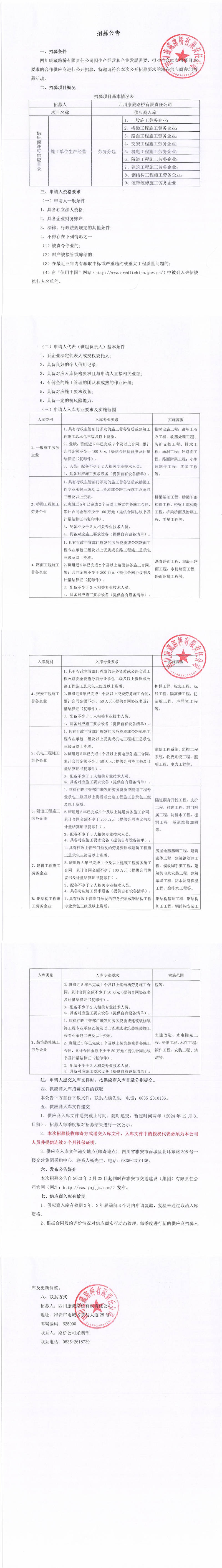 四川康藏路橋有限責(zé)任公司2023年供應(yīng)商入庫(施工單位生產(chǎn)經(jīng)營(yíng)勞務(wù)分包)招募公告