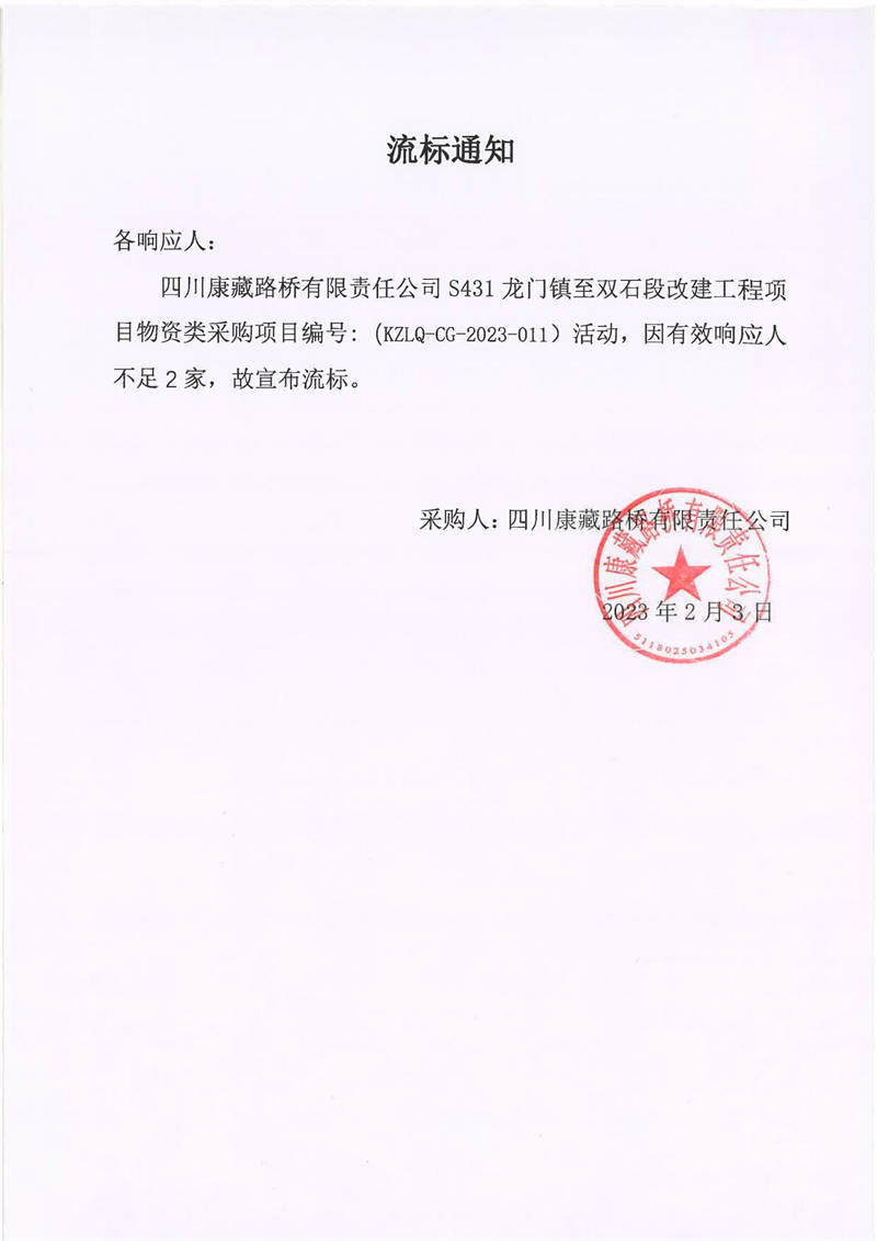 四川康藏路橋有限責任公司S431龍門鎮(zhèn)至雙石段改建工程項目物資類采購流標通知