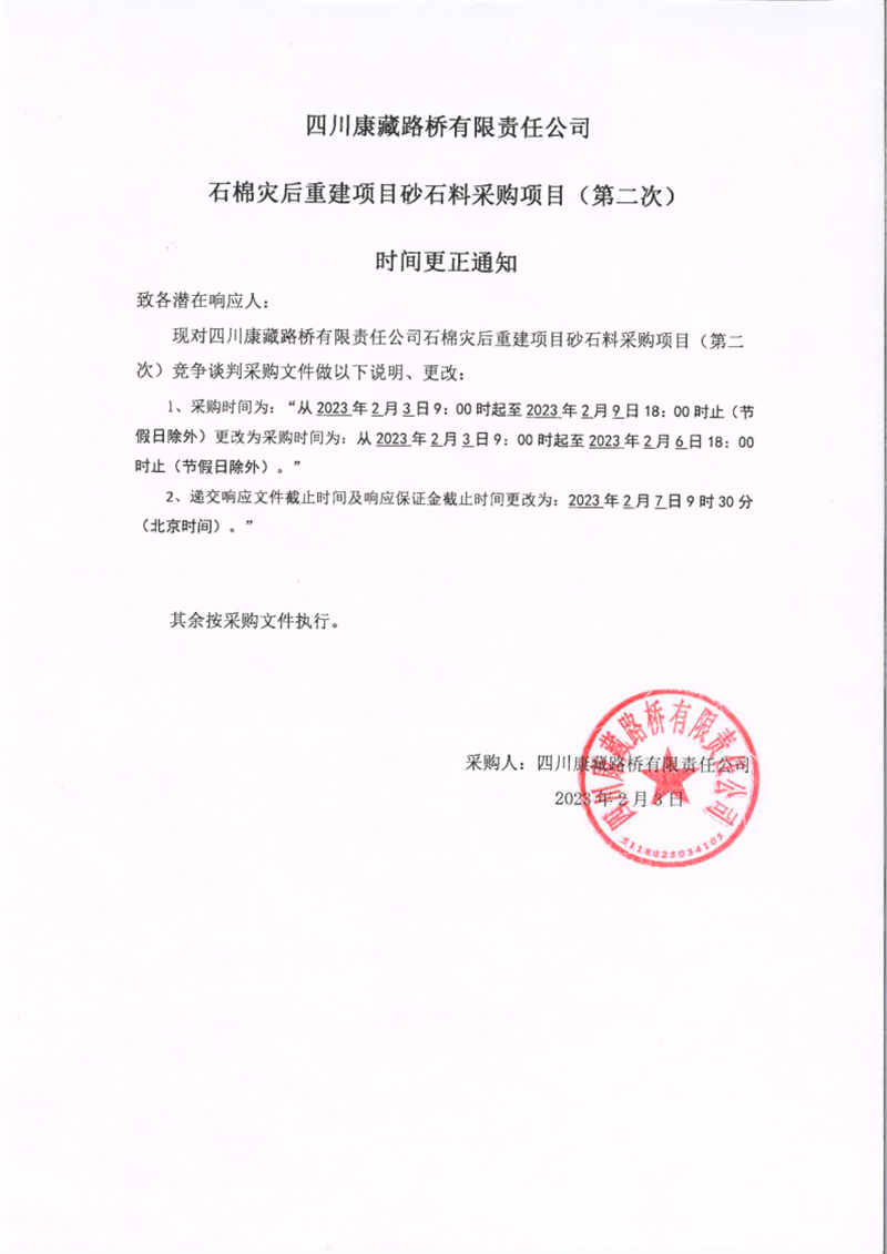 四川康藏路橋有限責(zé)任公司石棉災(zāi)后重建項目砂石料采購項目(第二次)時間更正通知