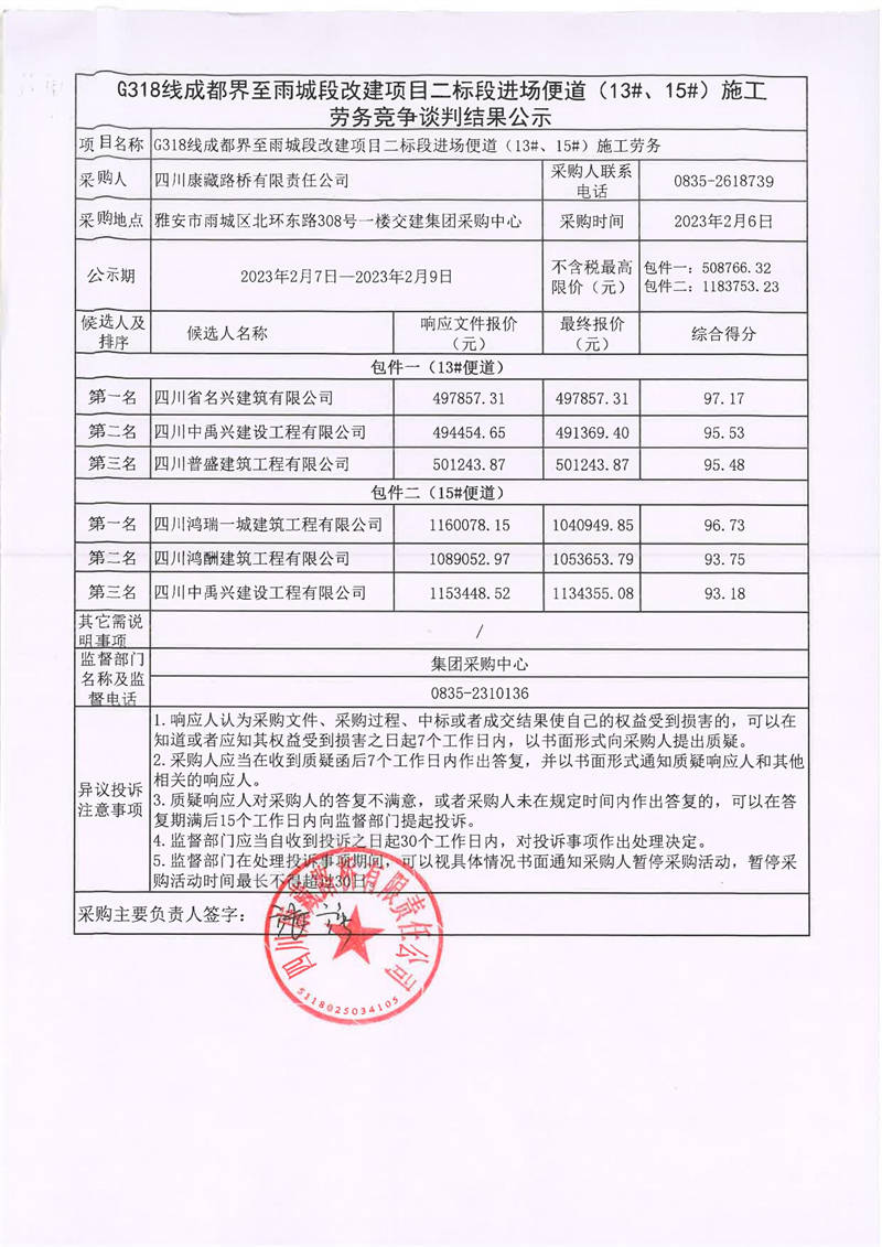 四川康藏路橋有限責(zé)任公司G318線成都界至雨城段改建項(xiàng)目二標(biāo)段進(jìn)場便道(13#、15#)施工勞務(wù)競爭談判結(jié)果公示