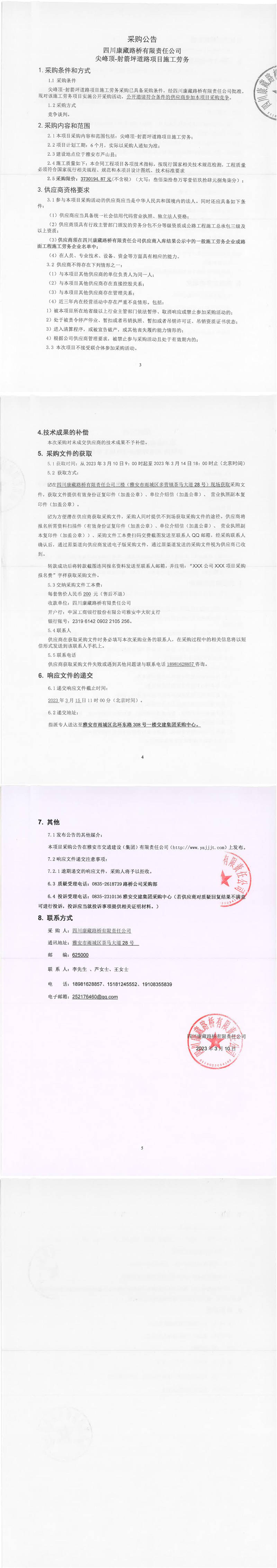 四川康藏路橋有限責任公司尖峰頂-射箭坪道路項目施工勞務采購公告