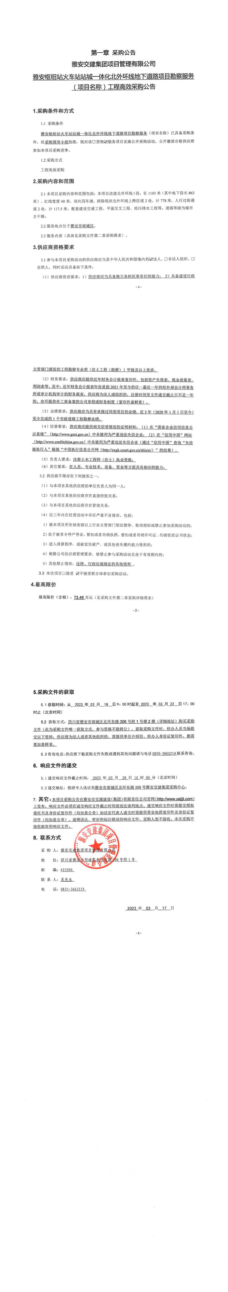 雅安交建集團項目管理有限公司雅安樞紐站火車站站城一體化北外環(huán)線地下道路項目勘察服務(wù)(項目名稱)工程高效采購公告