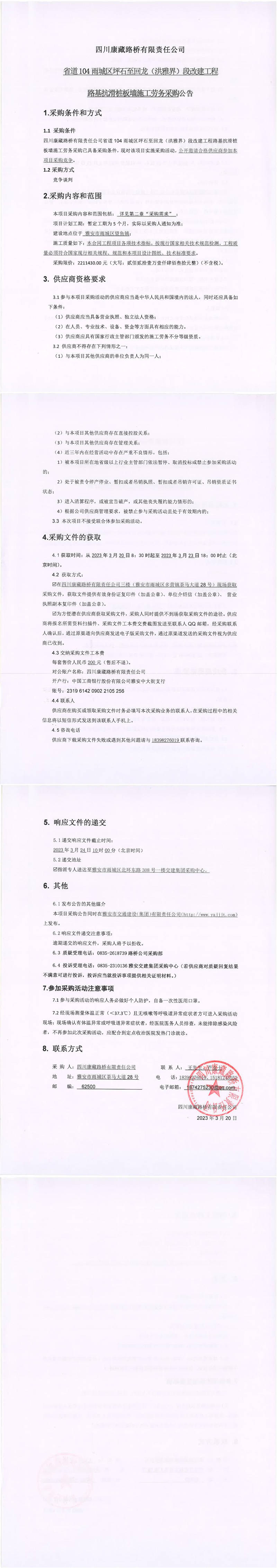 四川康藏路橋有限責(zé)任公司省道104雨城區(qū)坪石至回龍(洪雅界)段改建工程路基抗滑樁板墻施工勞務(wù)采購公告