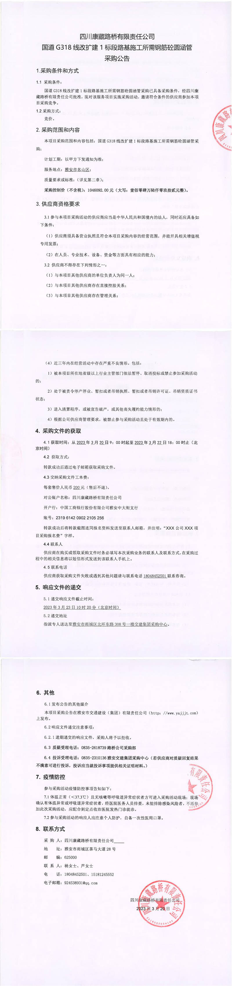 四川康藏路橋有限責(zé)任公司國道G318線改擴(kuò)建1標(biāo)段路基施工所需鋼筋砼圓涵管采購公告