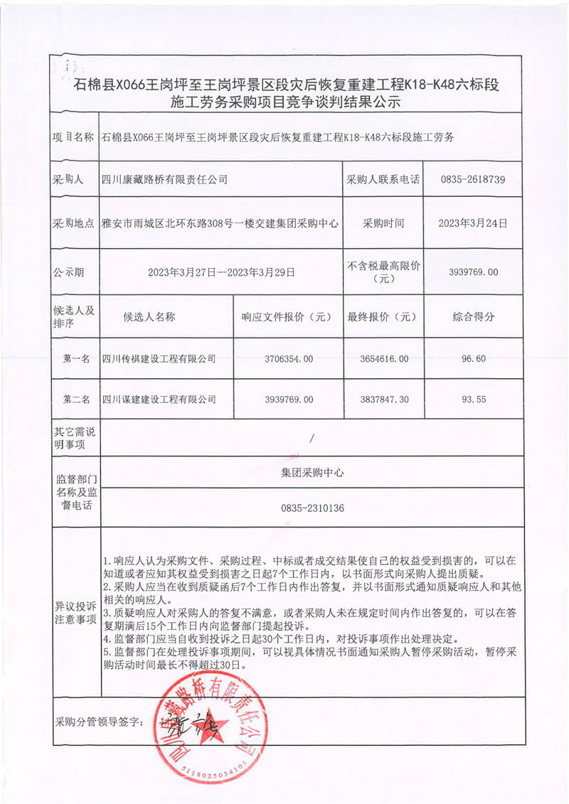 四川康藏路橋有限責(zé)任公司石棉縣X066王崗坪至王崗坪景區(qū)段災(zāi)后恢復(fù)重建工程K18-K48六標(biāo)段施工勞務(wù)采購(gòu)項(xiàng)目競(jìng)爭(zhēng)談判結(jié)果公示
