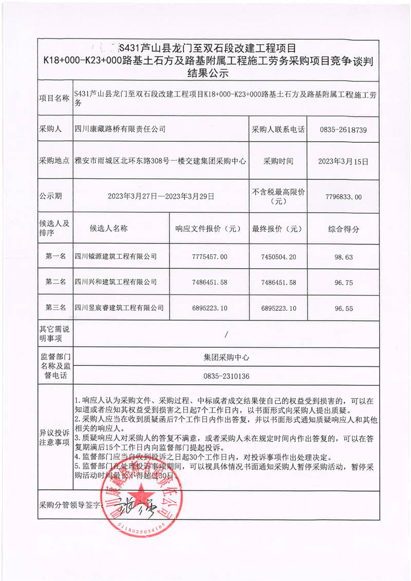 四川康藏路橋有限責任公司S431蘆山縣龍門至雙石段改建工程項目K18+000-K23+000路路基附屬工程施工勞務采購項目競爭談判結果公示