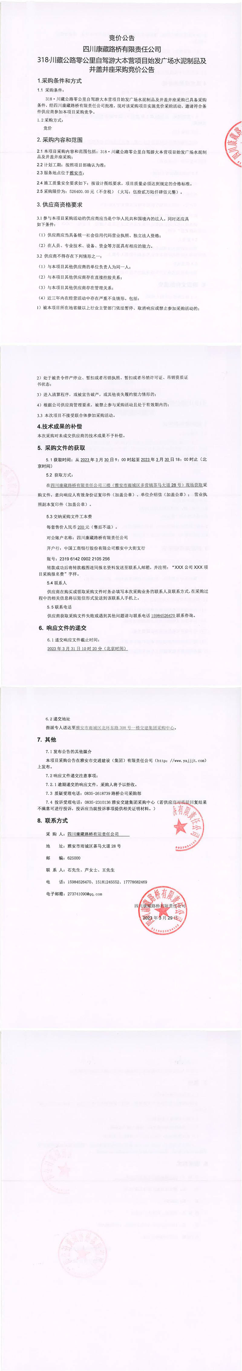 四川康藏路橋有限責(zé)任公司318·川藏公路零公里自駕游大本營項目始發(fā)廣場水泥制品及井蓋井座采購競價公告