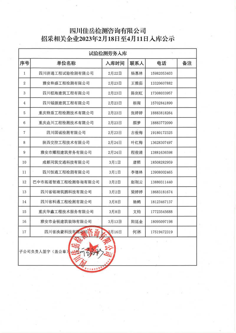 四川佳岳檢測咨詢有限公司(試驗(yàn)檢測勞務(wù)供應(yīng)商庫)2023年2月18日至4月11日入庫結(jié)果公示