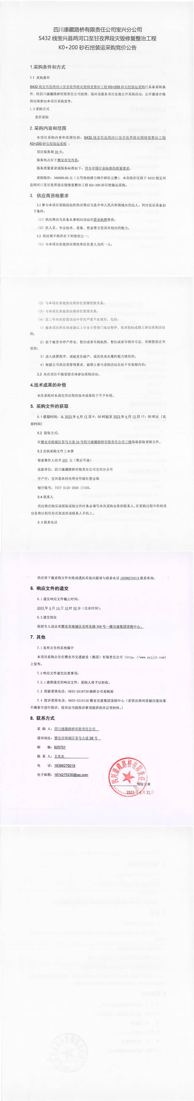 四川康藏路橋有限責(zé)任公司寶興分公司S432寶興縣兩河口至甘孜界段災(zāi)毀修復(fù)整治工程K0+200砂石挖裝運(yùn)采購競價公告