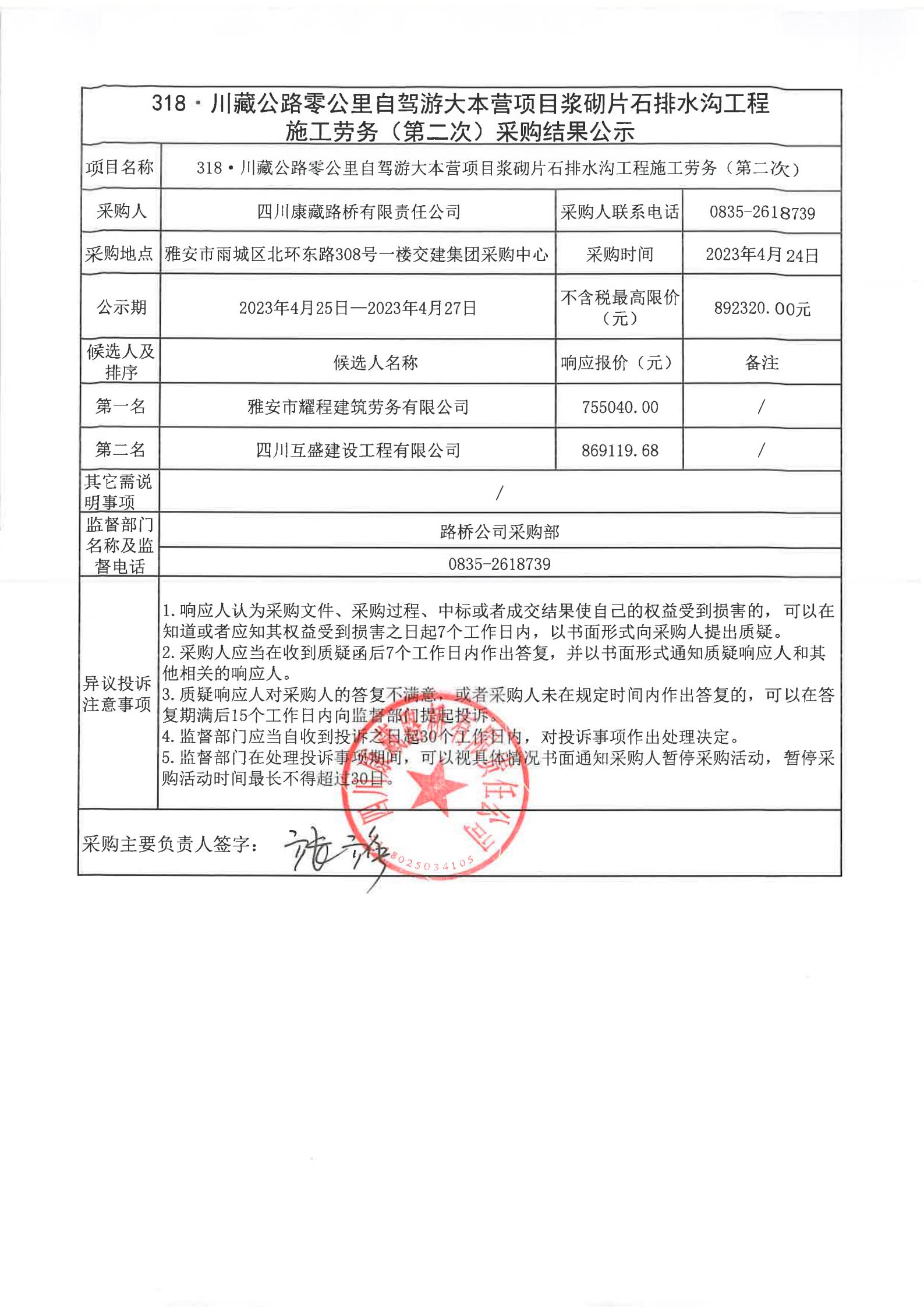 四川康藏路橋有限責(zé)任公司318·川藏公路零公里自駕游大本營(yíng)項(xiàng)目漿砌片石排水溝工程施工勞務(wù)(第二次)采購(gòu)結(jié)果公示