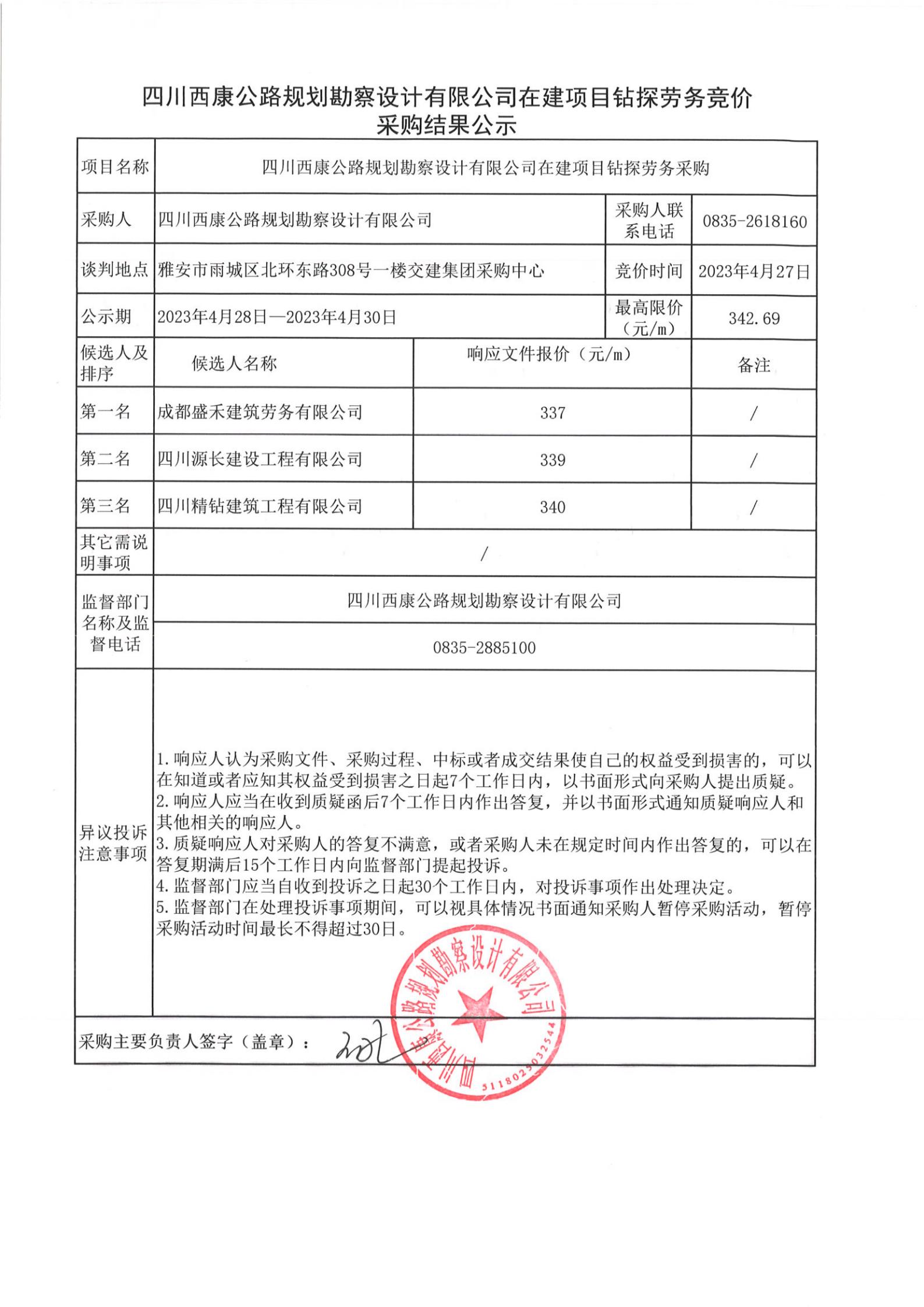 四川西康公路規(guī)劃勘察設(shè)計(jì)公司在建項(xiàng)目鉆探勞務(wù)競價采購結(jié)果公示