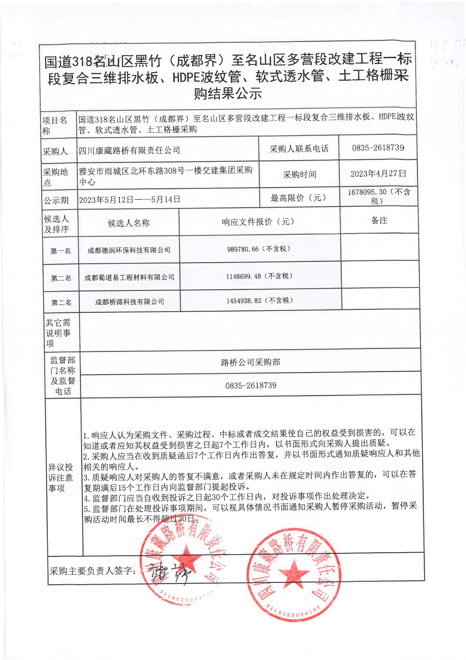 四川康藏路橋有限責(zé)任公司國(guó)道318名山區(qū)黑竹(成都界)至雨城區(qū)多營(yíng)段改建工程一標(biāo)段復(fù)合三維排水板、HDPE波紋管、軟式透水管、土工格柵采購(gòu)結(jié)果公示
