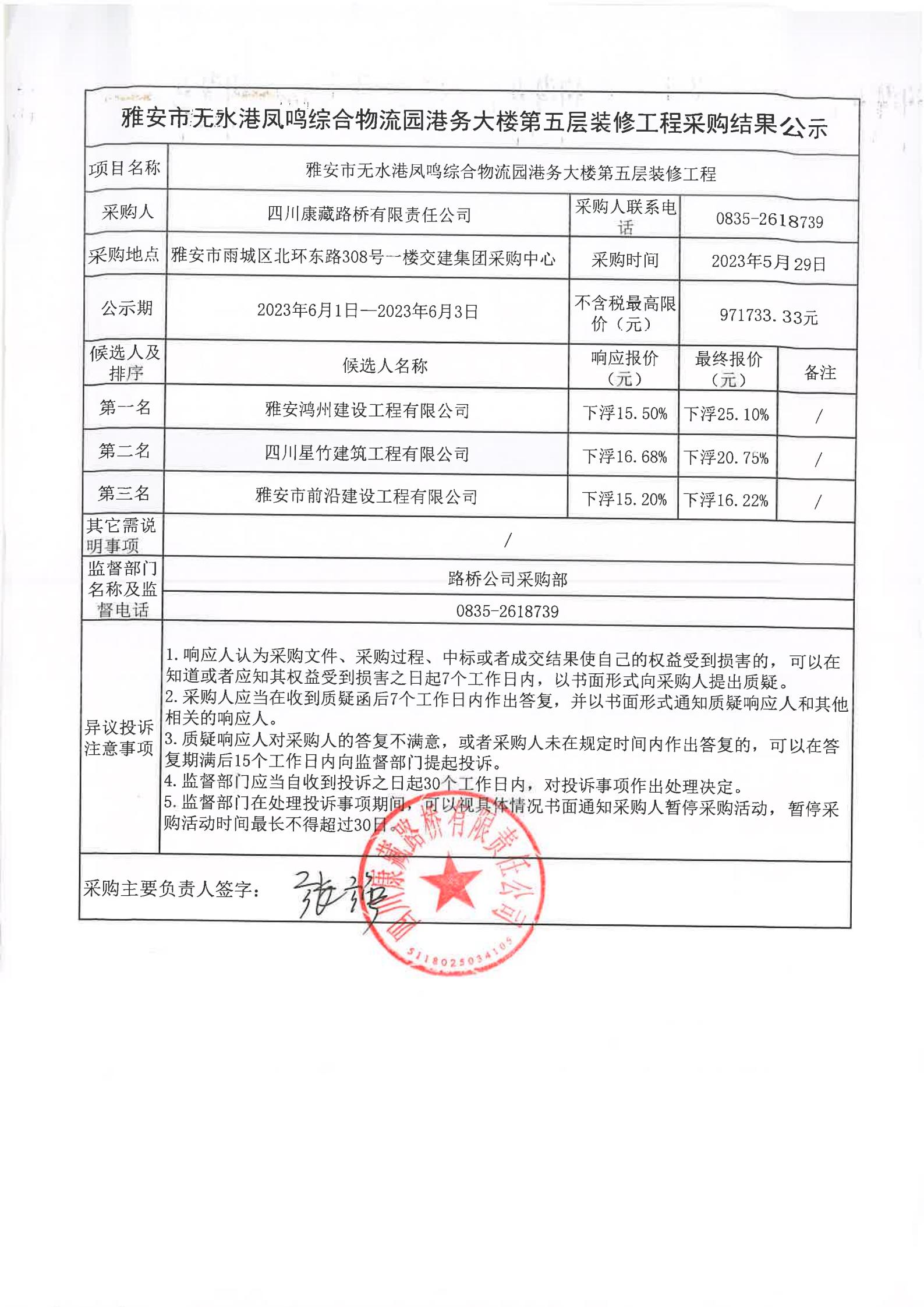 四川康藏路橋有限責任公司雅安市無水港鳳鳴綜合物流園港務(wù)大樓第五層裝修工程采購結(jié)果公示