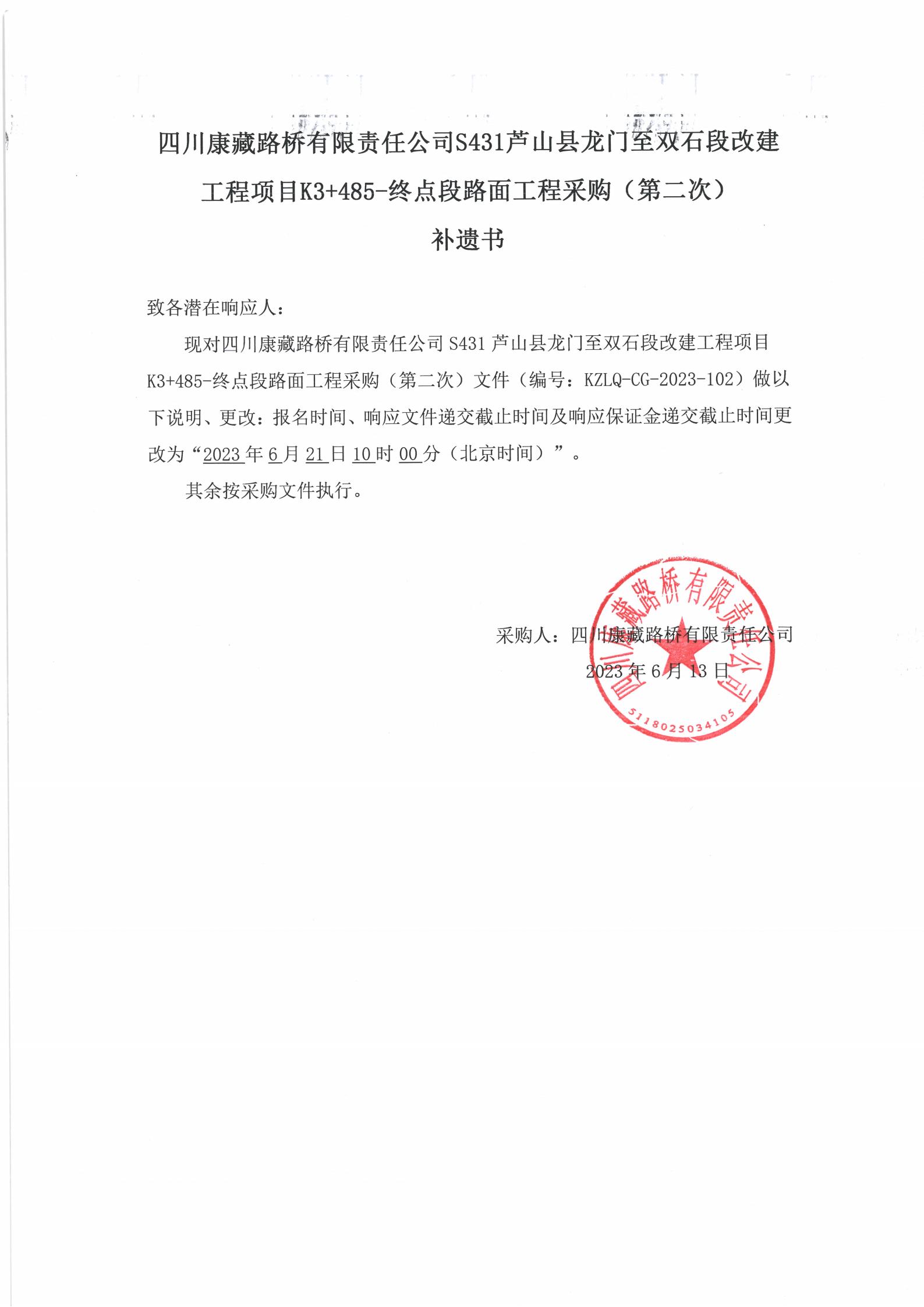 四川康藏路橋有限責任公司S431蘆山縣龍門至雙石段改建工程項目K3+485-終點段路面工程采購(第二次)補遺書