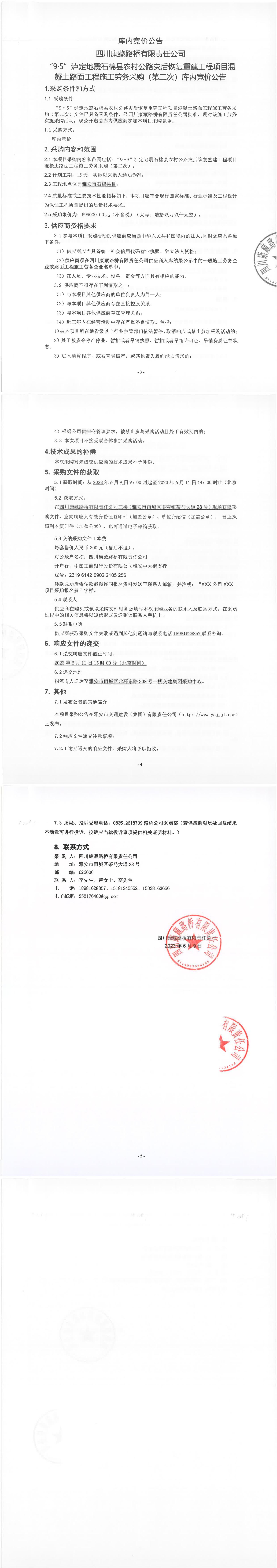 四川康藏路橋有限責任公司“9·5”瀘定地震石棉縣農(nóng)村公路災(zāi)后恢復重建工程項目混凝土路面工程施工勞務(wù)采購(第二次)庫內(nèi)競價公告