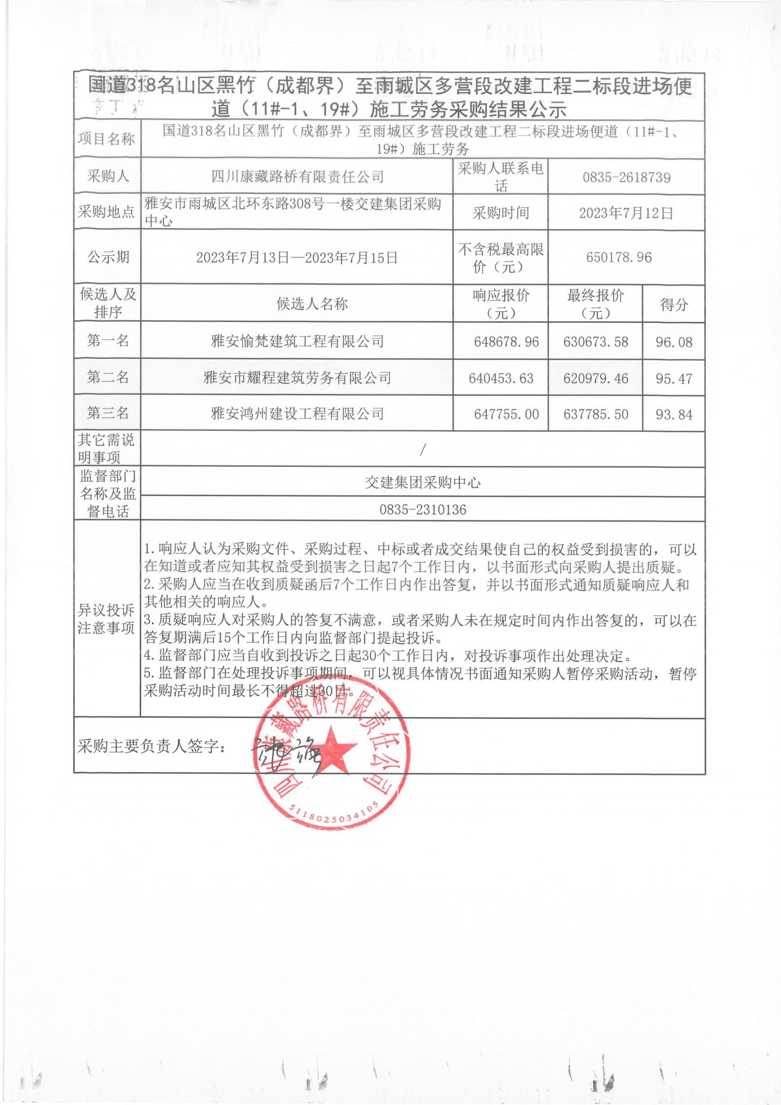 四川康藏路橋有限責任公司國道318名山區(qū)黑竹(成都界)至雨城區(qū)多營段改建工程二標段進場便道(11#-1、19#)施工勞務采購結果公示