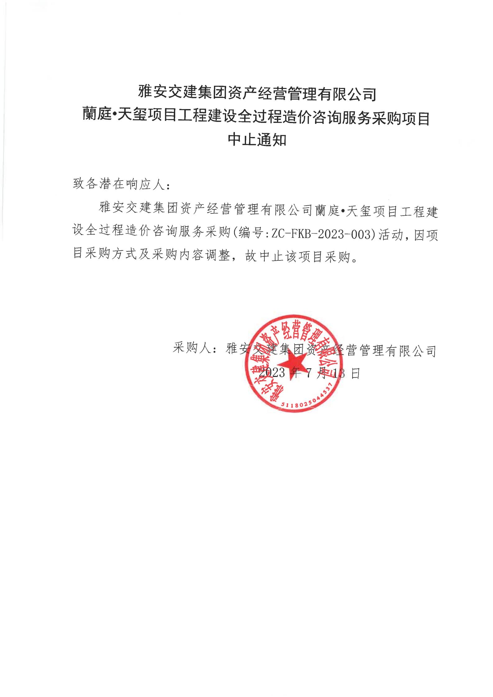 雅安交建集團資產經營管理有限公司蘭庭·天璽項目工程建設全過程造價咨詢服務采購項目中止通知
