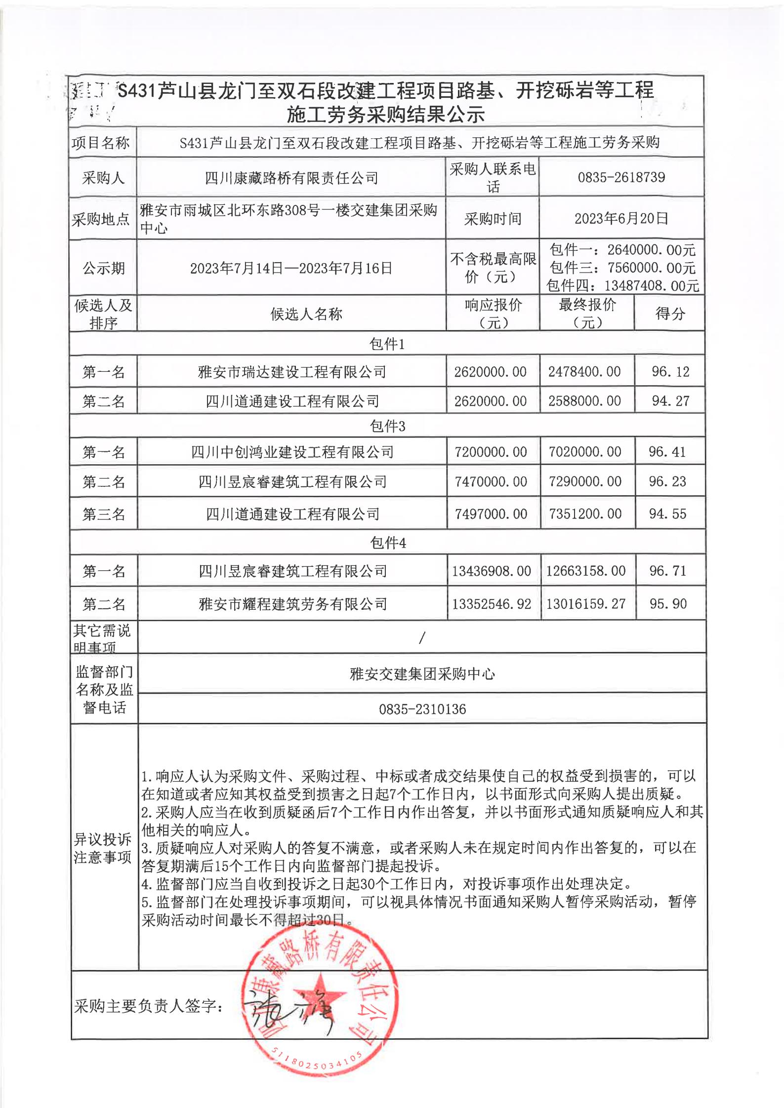 四川康藏路橋有限責(zé)任公司S431蘆山縣龍門至雙石段改建工程項目路基、開挖礫巖等工程施工勞務(wù)采購結(jié)果公示