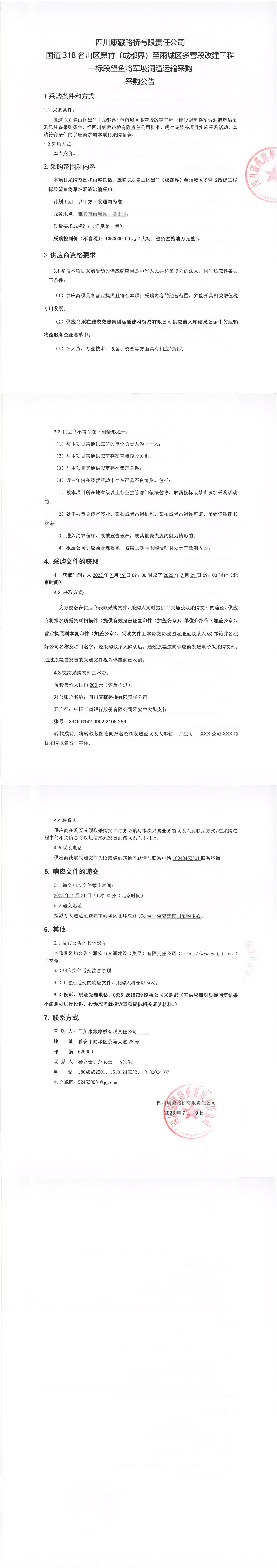 四川康藏路橋有限責(zé)任公司國道318名山區(qū)黑竹(成都界)至雨城區(qū)多營段改建工程一標(biāo)段望魚將軍坡洞渣運(yùn)輸采購公告