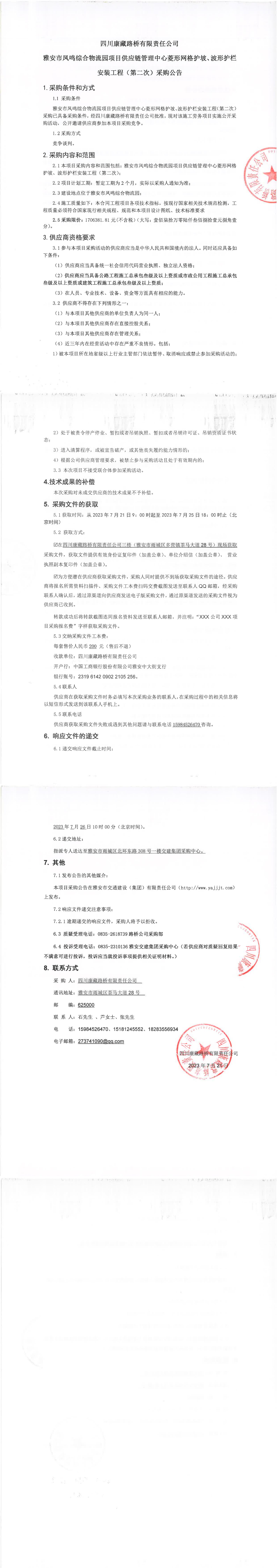 四川康藏路橋有限責(zé)任公司雅安市鳳鳴綜合物流園項(xiàng)目供應(yīng)鏈管理中心菱形網(wǎng)格護(hù)坡、波形護(hù)欄安裝工程(第二次)采購公告