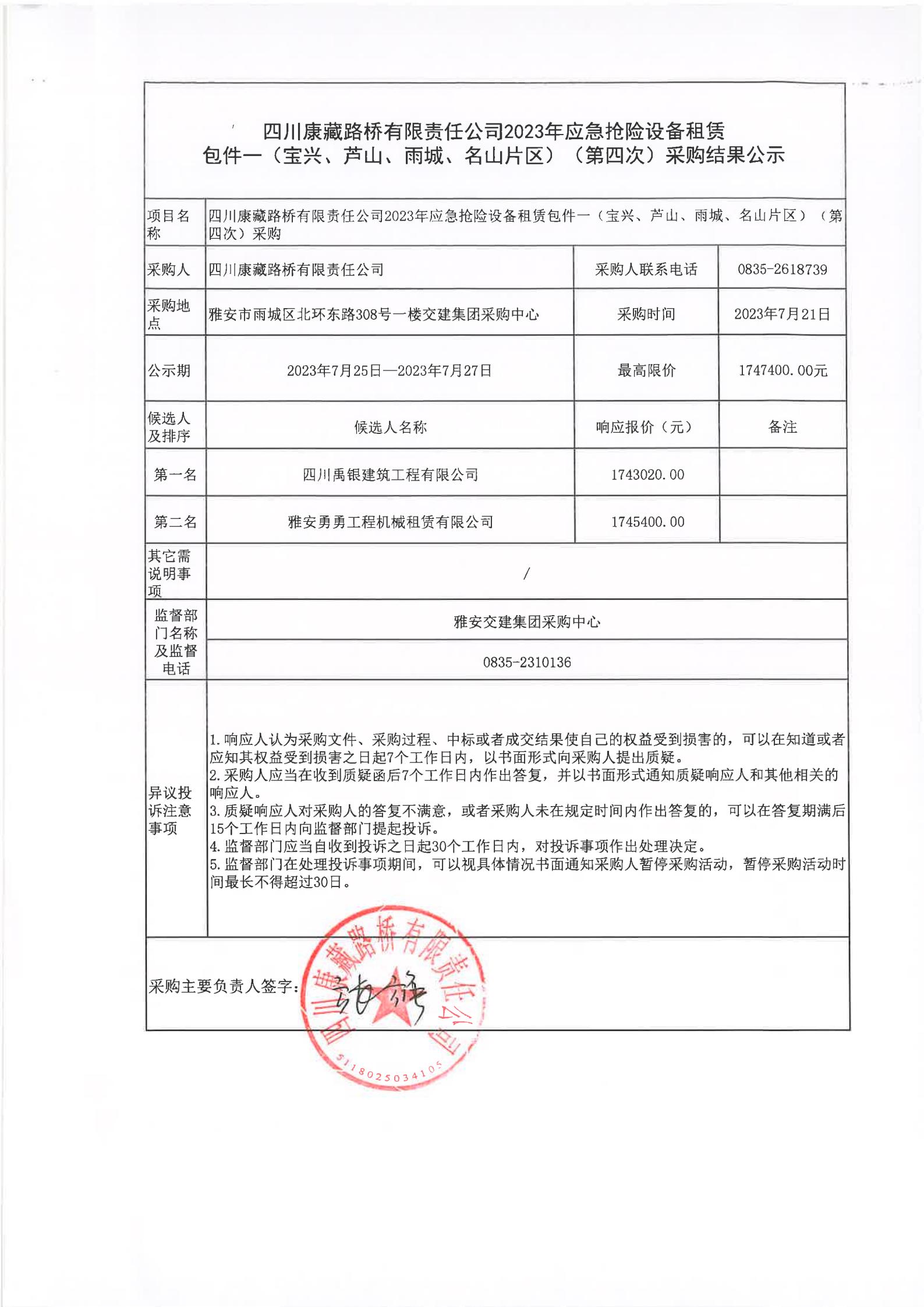 四川康藏路橋有限責(zé)任公司2023年應(yīng)急搶險設(shè)備租賃包件一(寶興、蘆山、雨城、名山片區(qū))(第四次)采購結(jié)果公示