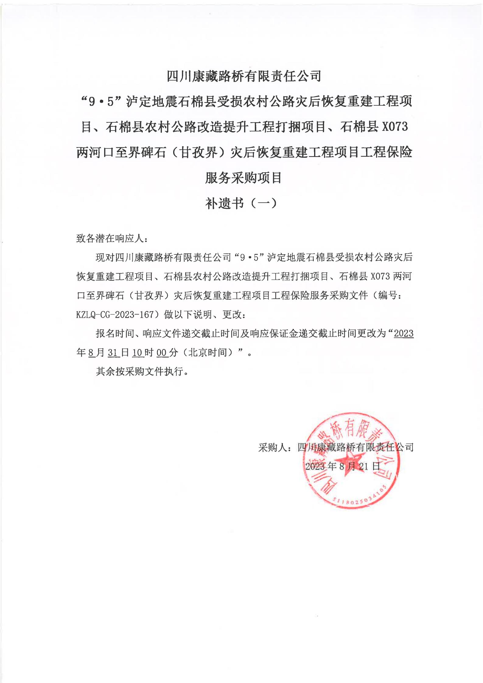 四川康藏路橋有限責任公司“9·5”瀘定地震石棉縣受損農(nóng)村公路災后恢復重建工程項目、石棉縣農(nóng)村公路改造提升工程打捆項目、石棉縣X073兩河口至界碑石(甘孜界)災后恢復重建工程項目工程保險服務(wù)采購項目補遺書(一)