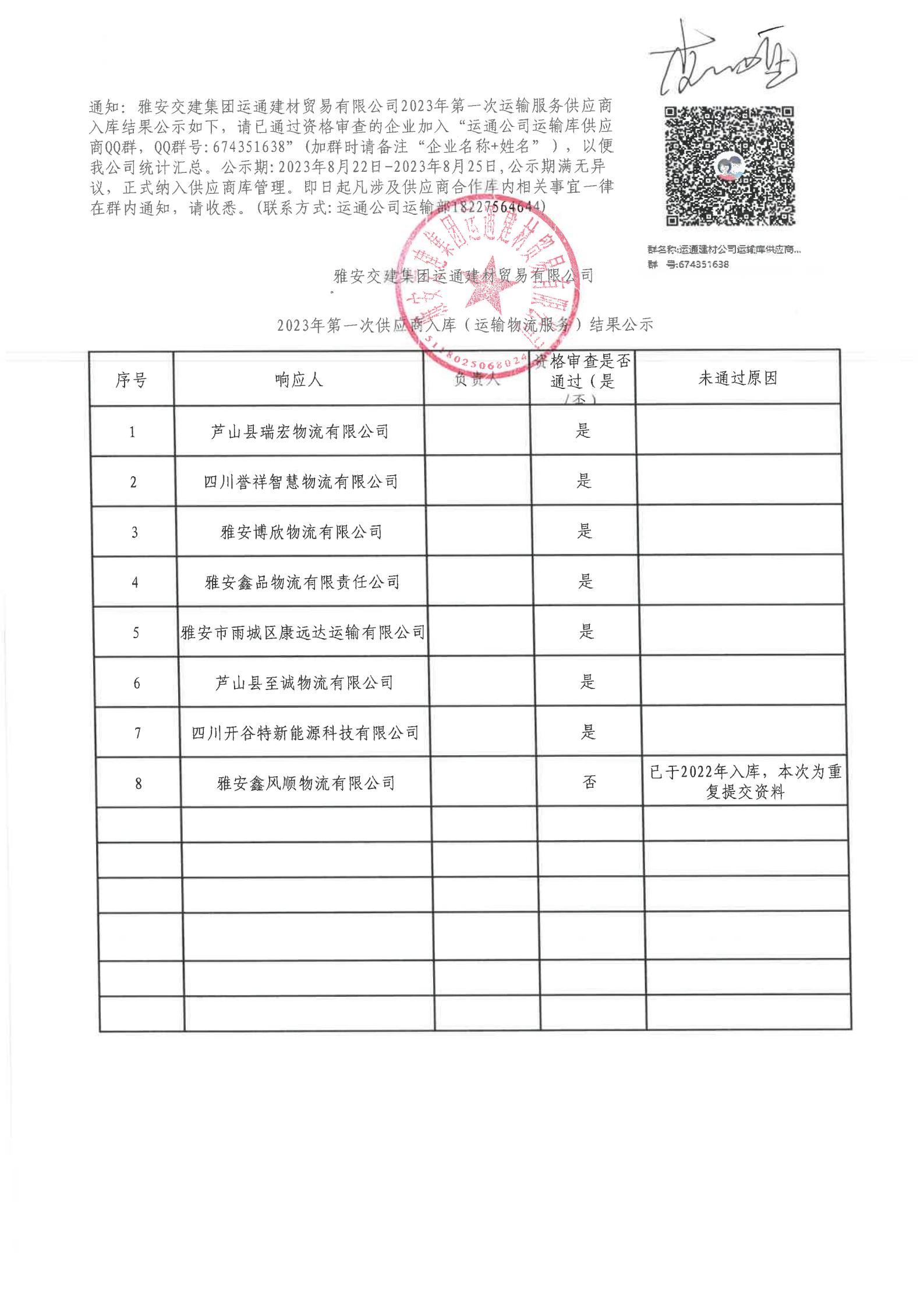 雅安交建集團(tuán)運通建材貿(mào)易有限公司2023年第一次供應(yīng)商入庫(運輸物流服務(wù))結(jié)果公示