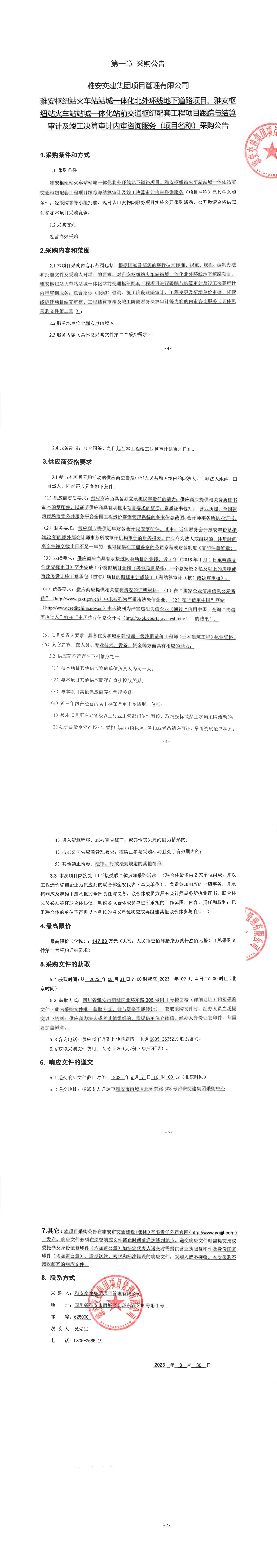 雅安交建集團(tuán)項目管理有限公司雅安樞紐站火車站站城一體化北外環(huán)線地下道路項目、樞紐站火車站站成一體化站前交通樞紐配套工程項目跟蹤與結(jié)算審計及竣工決算審計內(nèi)審咨詢服務(wù)(項目名稱)采購公告