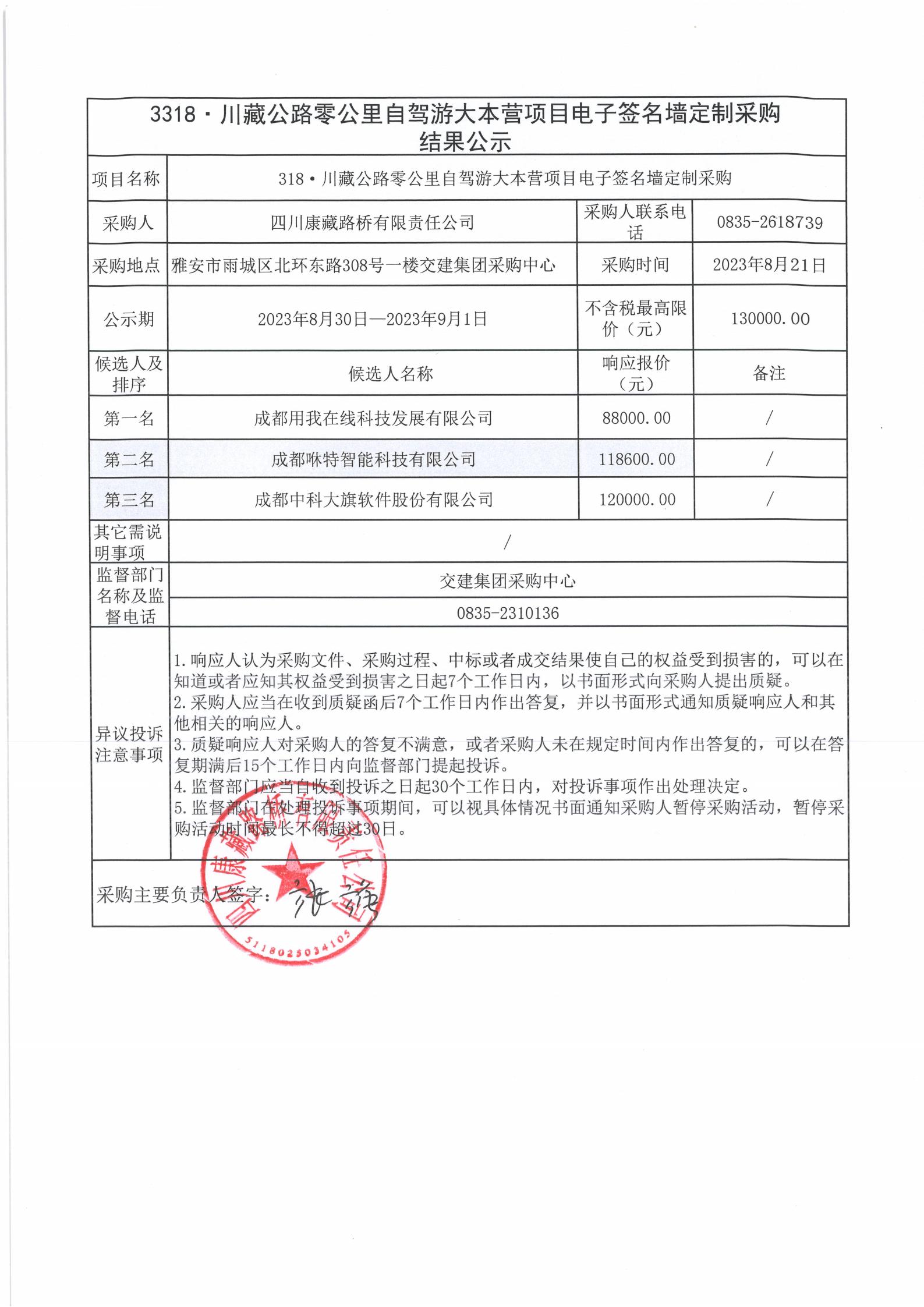 四川康藏路橋有限責(zé)任公司318·川藏公路零公里自駕游大本營項(xiàng)目電子簽名墻定制采購結(jié)果公示