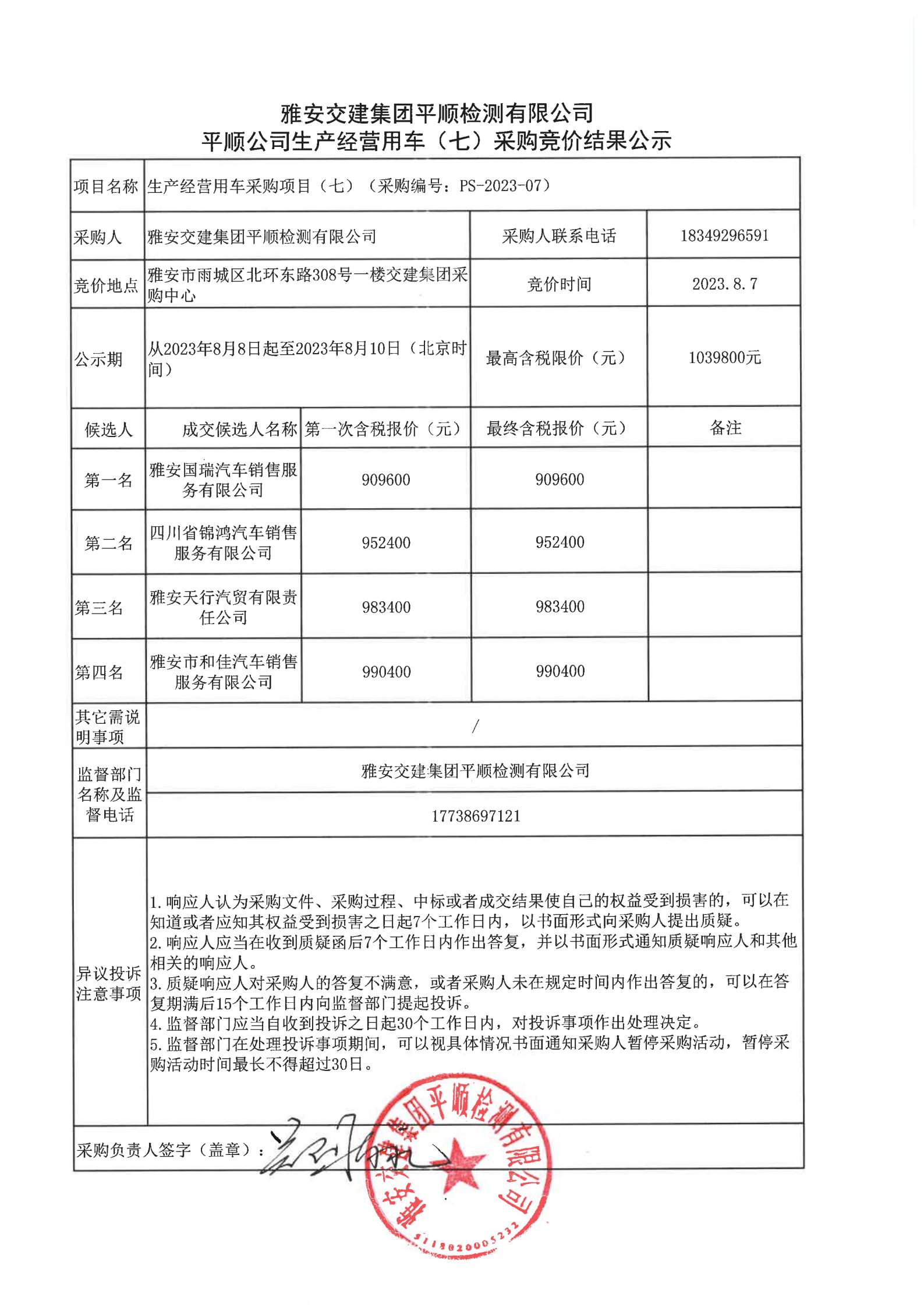雅安交建集團(tuán)平順檢測(cè)有限公司平順公司生產(chǎn)經(jīng)營(yíng)用車(chē)(七)采購(gòu)競(jìng)價(jià)結(jié)果公示