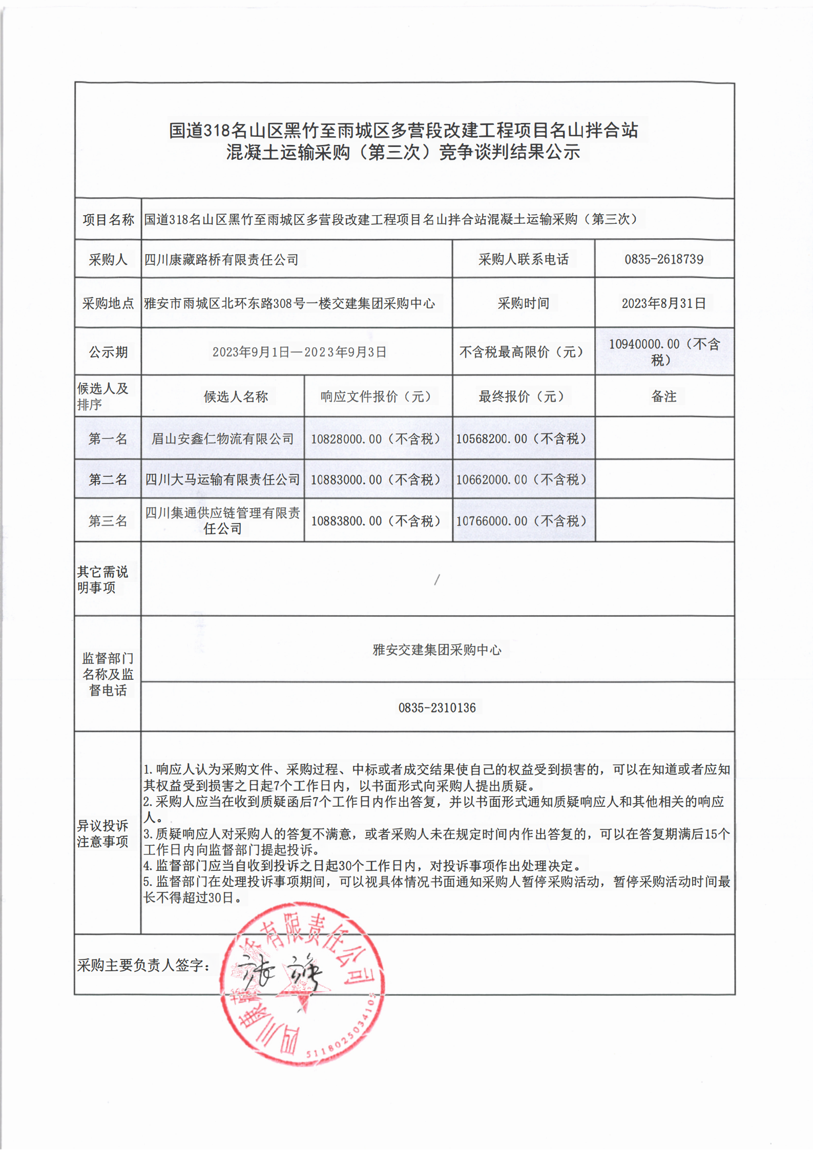 四川康藏路橋有限責(zé)任公司國道318名山區(qū)黑竹至至雨城區(qū)多營段改建工程項(xiàng)目名山拌合站混凝土運(yùn)輸采購(第三次)競爭談判結(jié)果公示