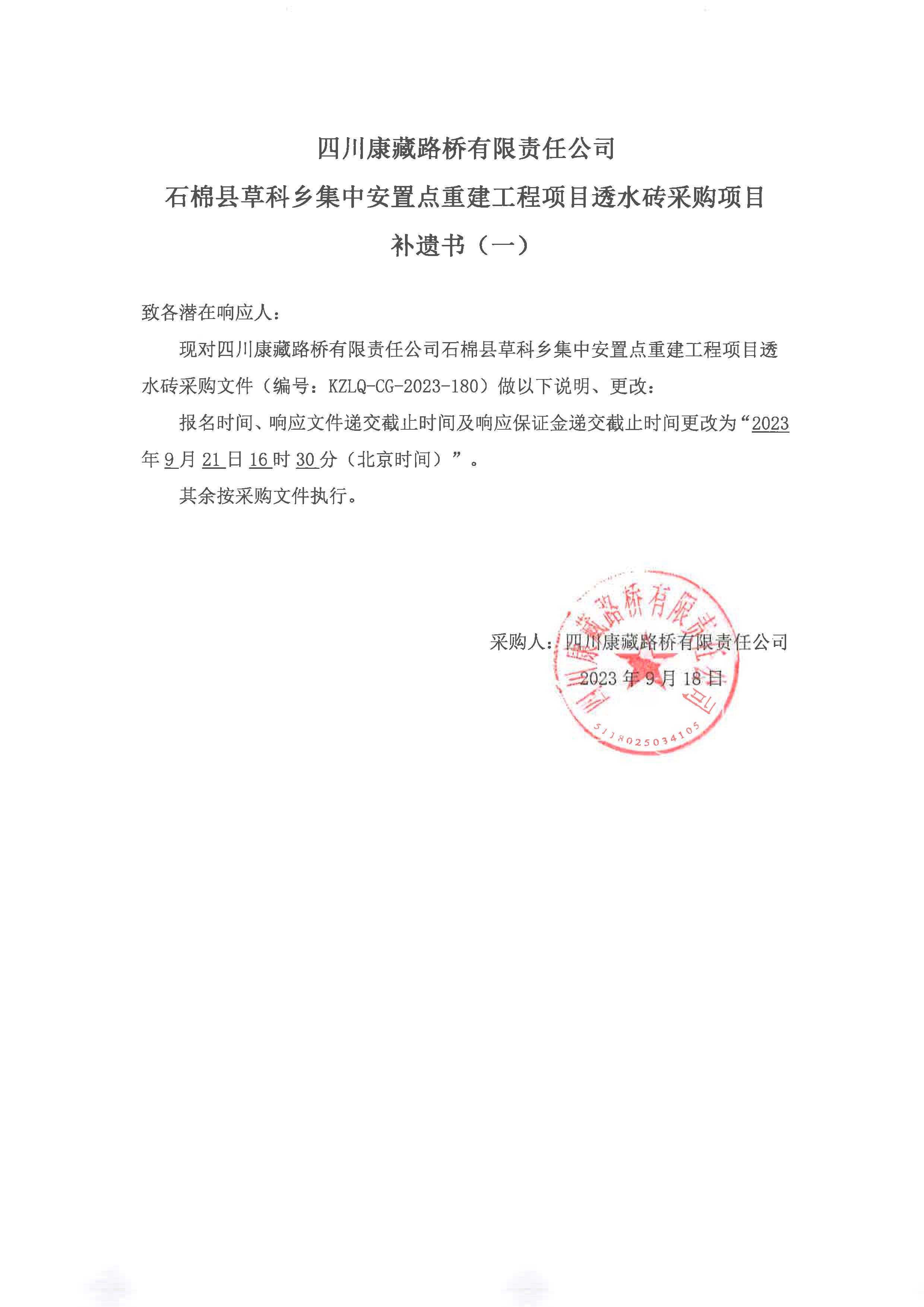 四川康藏路橋有限責(zé)任公司石棉縣草科鄉(xiāng)集中安置點(diǎn)重建工程項(xiàng)目透水磚采購(gòu)項(xiàng)目補(bǔ)遺書(shū)(一)