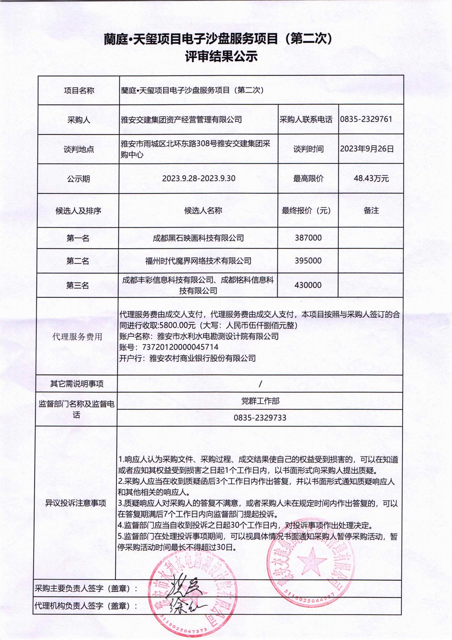 雅安交建集團(tuán)資產(chǎn)經(jīng)營管理有限公司蘭庭•天璽項(xiàng)目電子沙盤服務(wù)項(xiàng)目(第二次)評(píng)審結(jié)果公示