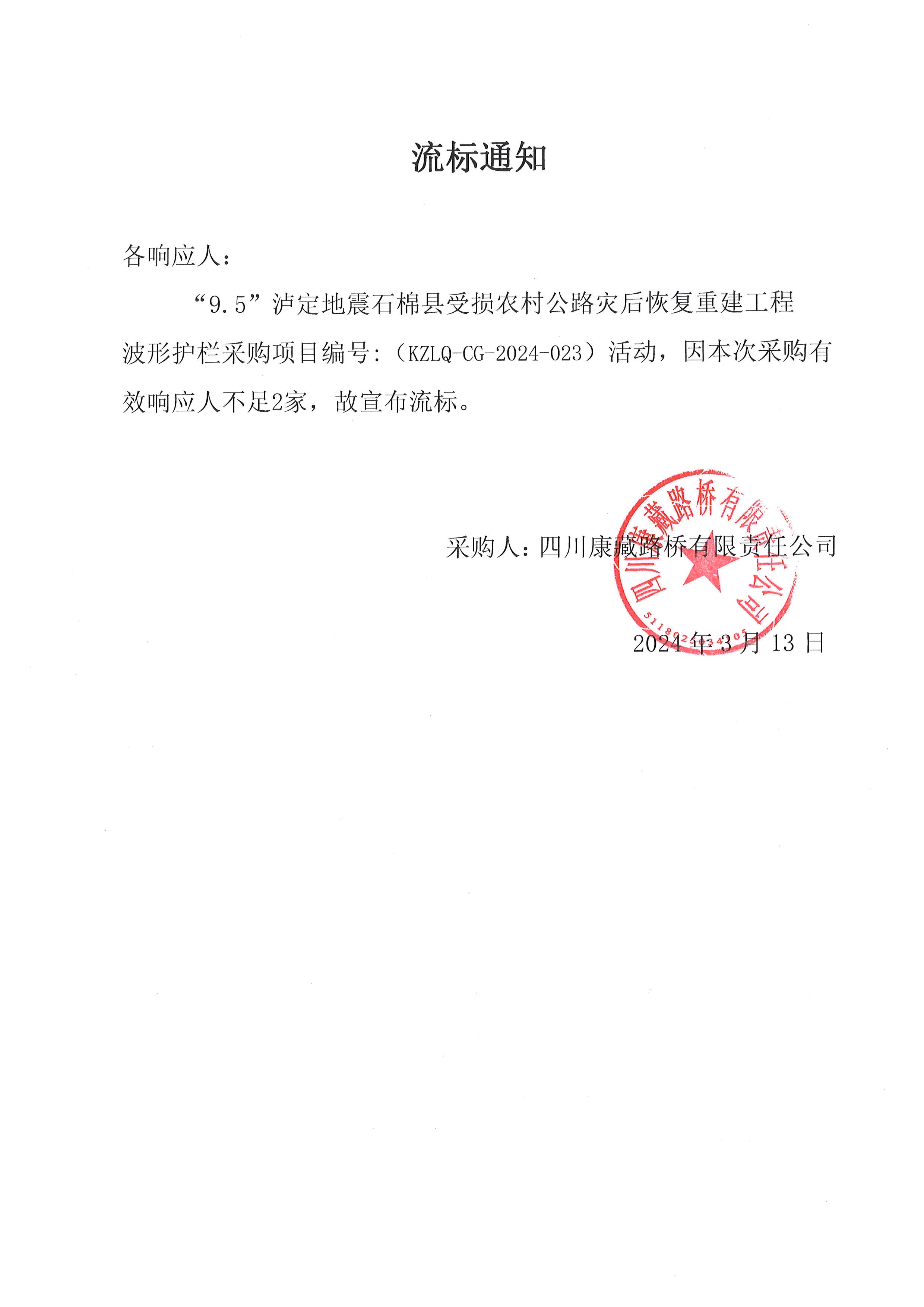 四川康藏路橋有限責任公司“9.5”瀘定地震石棉縣受損農(nóng)村公路災(zāi)后恢復(fù)重建工程波形護欄采購流標通知