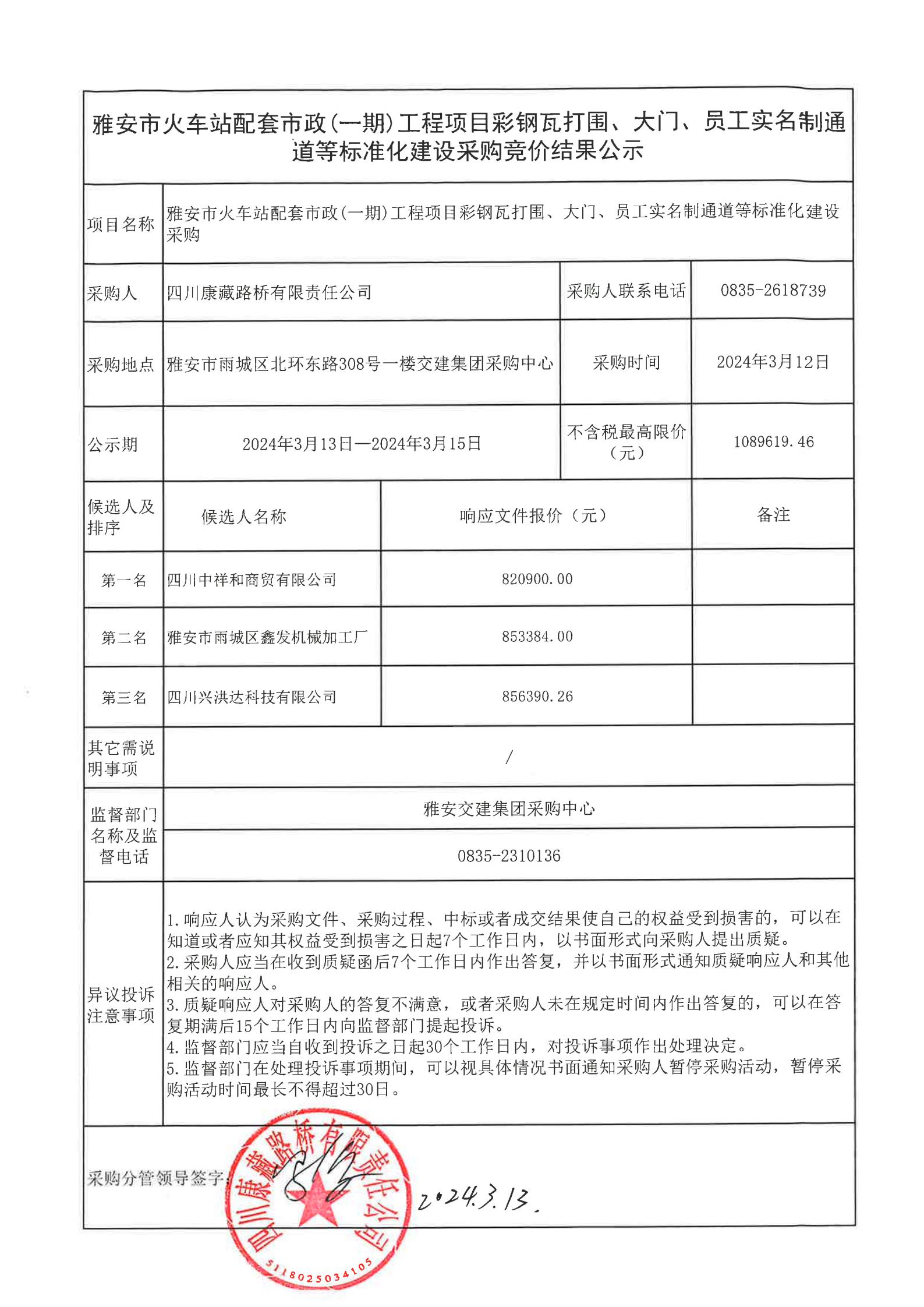 四川康藏路橋有限責(zé)任公司雅安市火車站配套市政(一期)工程項目彩鋼瓦打圍、大門、員工實名制通道等標(biāo)準(zhǔn)化建設(shè)采購結(jié)果公示