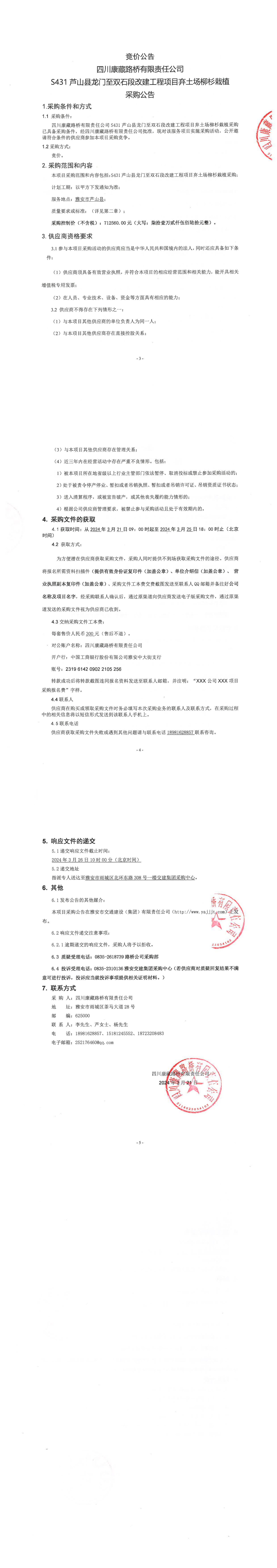四川康藏路橋有限責(zé)任公司S431蘆山縣龍門至雙石段改建工程項(xiàng)目棄土場(chǎng)柳杉栽植采購(gòu)公告