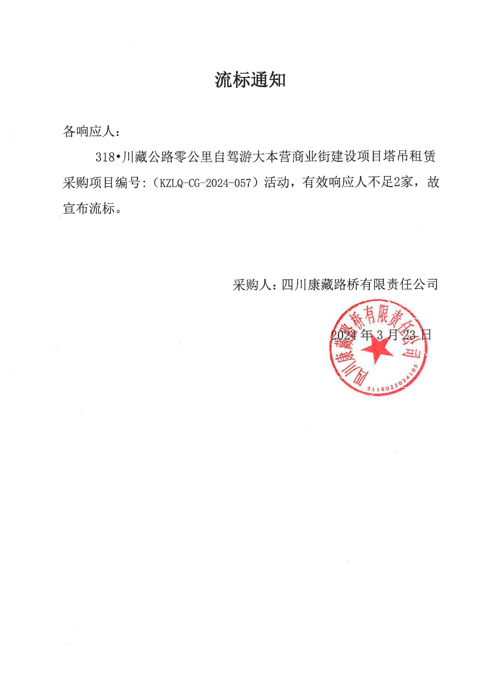 四川康藏路橋有限責(zé)任公司318•川藏公路零公里自駕游大本營(yíng)商業(yè)街建設(shè)項(xiàng)目塔吊租賃采購(gòu)流標(biāo)通知