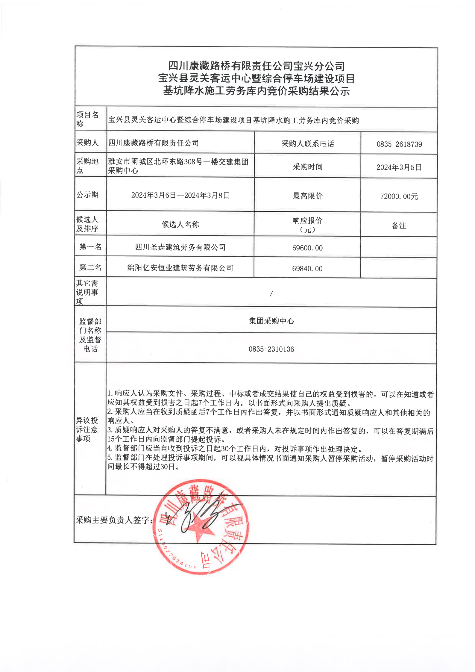 四川康藏路橋有限責(zé)任公司寶興分公司寶興縣靈關(guān)客運(yùn)站中心暨綜合停車(chē)場(chǎng)建設(shè)項(xiàng)目基坑降水施工勞務(wù)庫(kù)內(nèi)競(jìng)價(jià)采購(gòu)結(jié)果公示