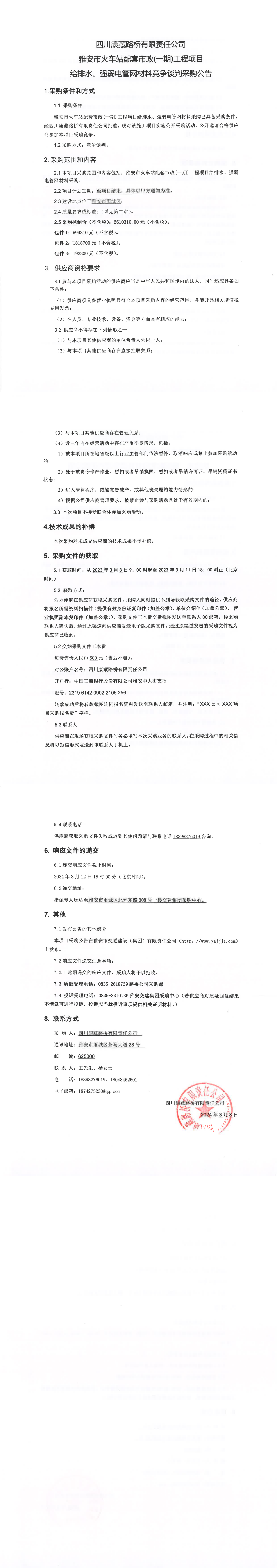 四川康藏路橋有限責(zé)任公司雅安市火車(chē)站配套市政(一期)工程項(xiàng)目給排水、強(qiáng)弱電管網(wǎng)材料競(jìng)爭(zhēng)談判采購(gòu)公告