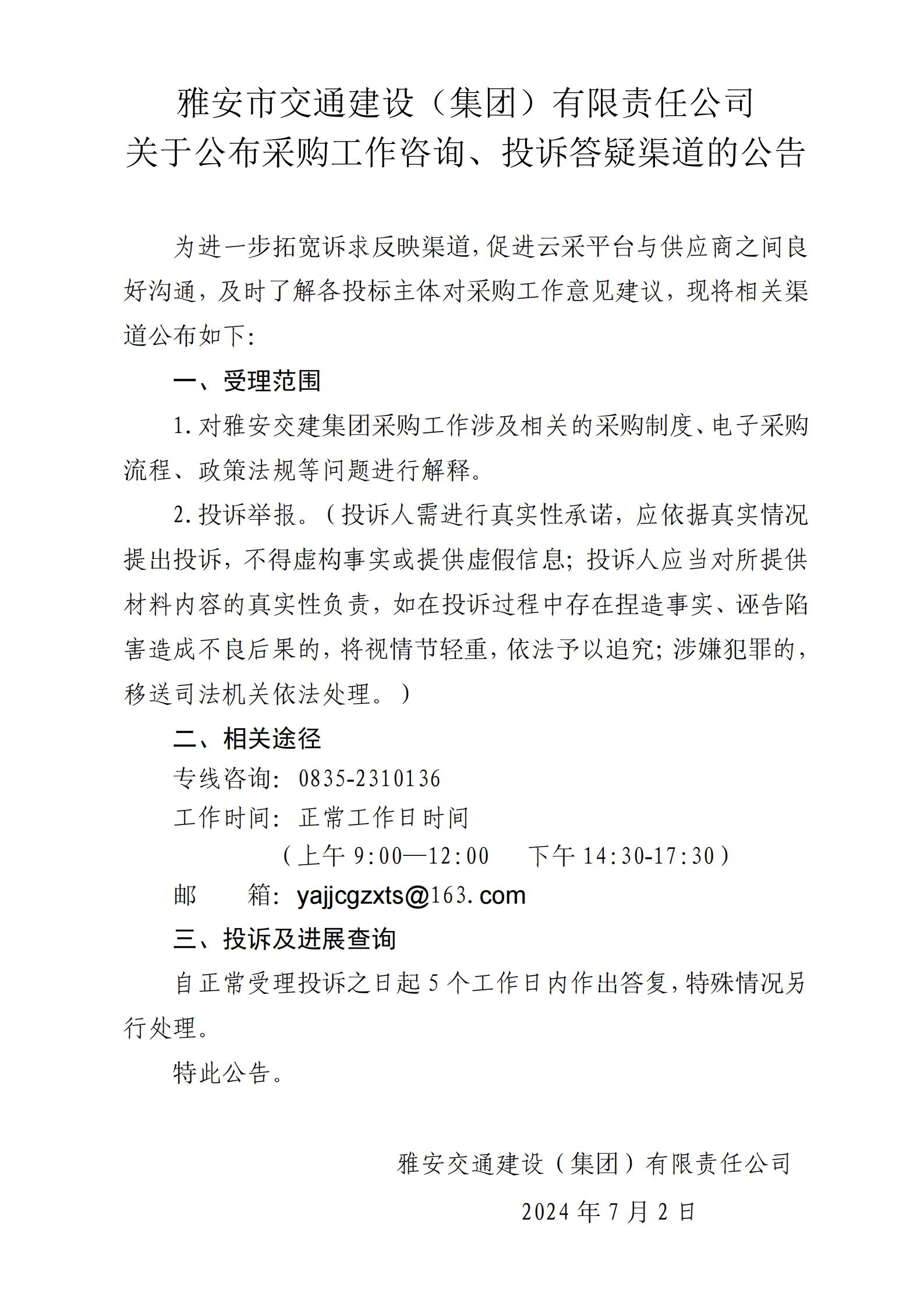 雅安市交通建設(集團)有限責任公司關于公布采購工作咨詢、投訴答疑渠道的公告