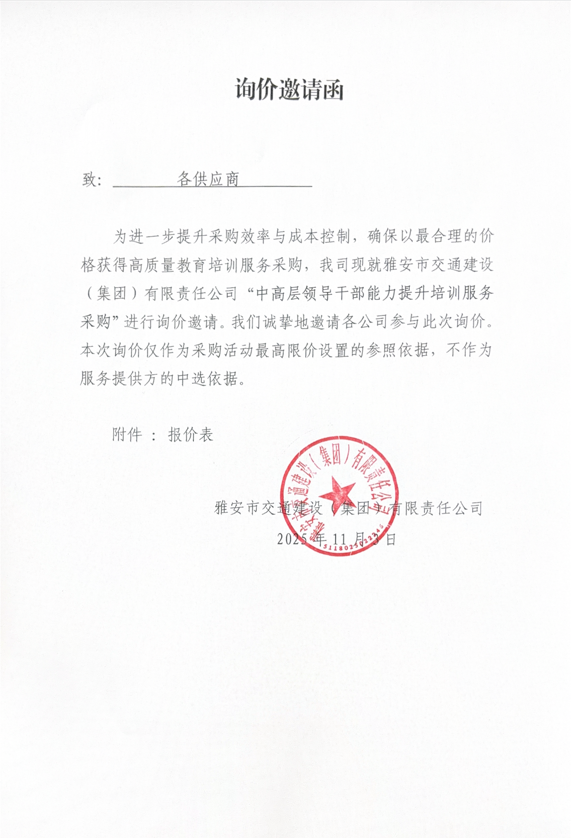 關(guān)于雅安交建集團(tuán)下屬子公司主要負(fù)責(zé)人經(jīng)濟(jì)責(zé)任審計(jì)項(xiàng)目限價的詢價函