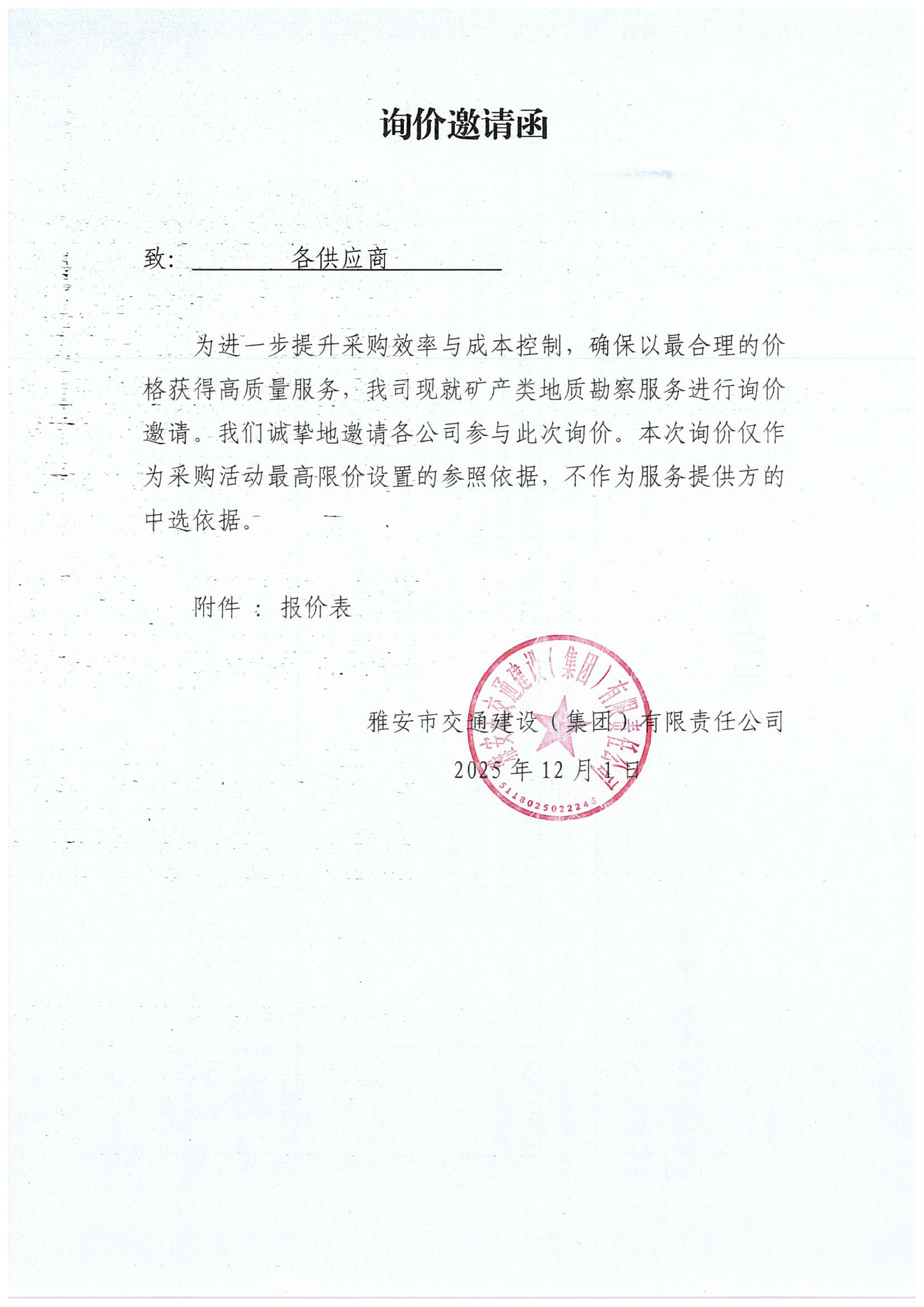 關(guān)于雅安市交通建設(shè)(集團(tuán))有限責(zé)任公司礦產(chǎn)類(lèi)地質(zhì)勘察服務(wù)限價(jià)的詢價(jià)函
