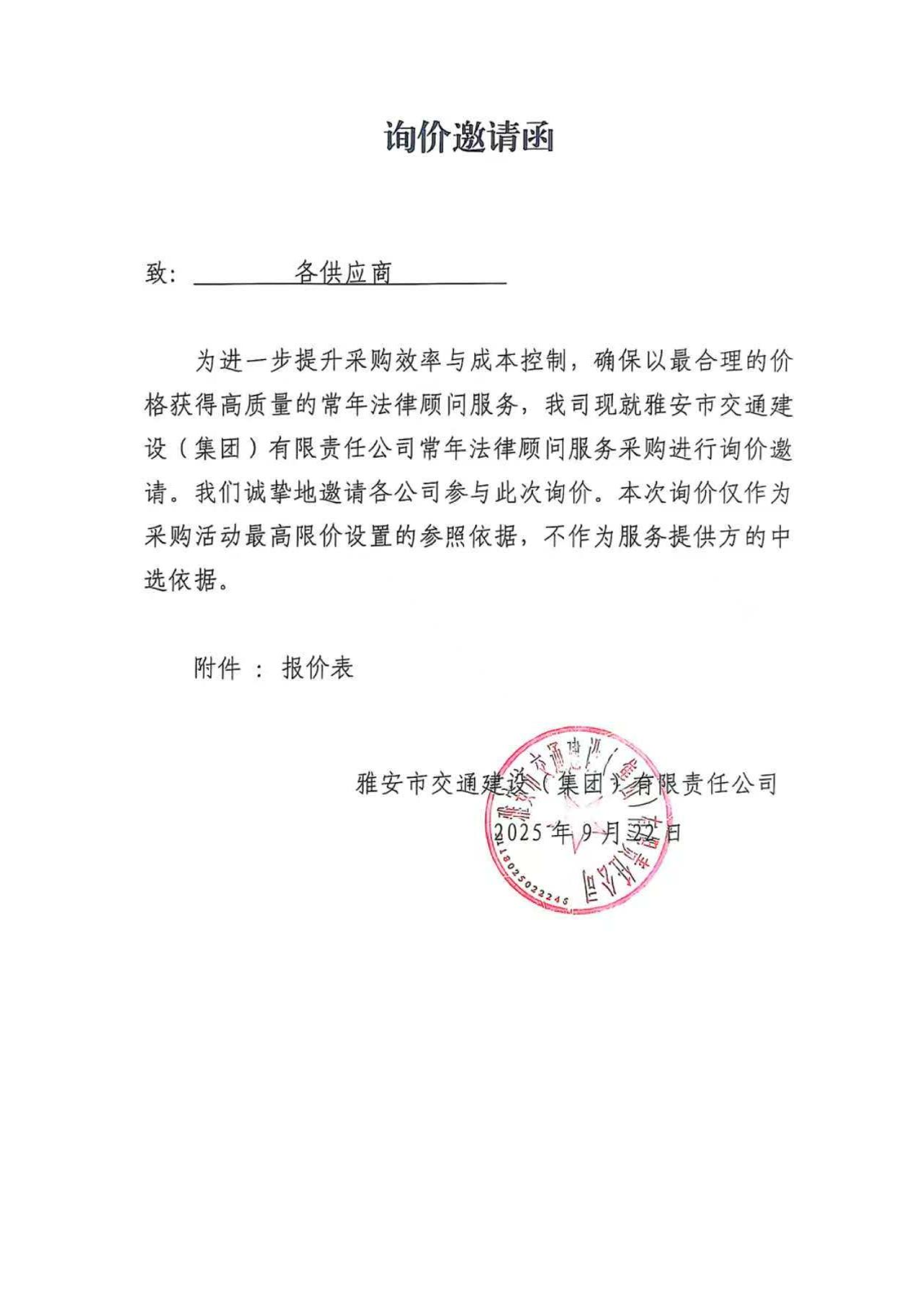 關于雅安市交通建設(集團)有限責任公司常年法律顧問服務的詢價函