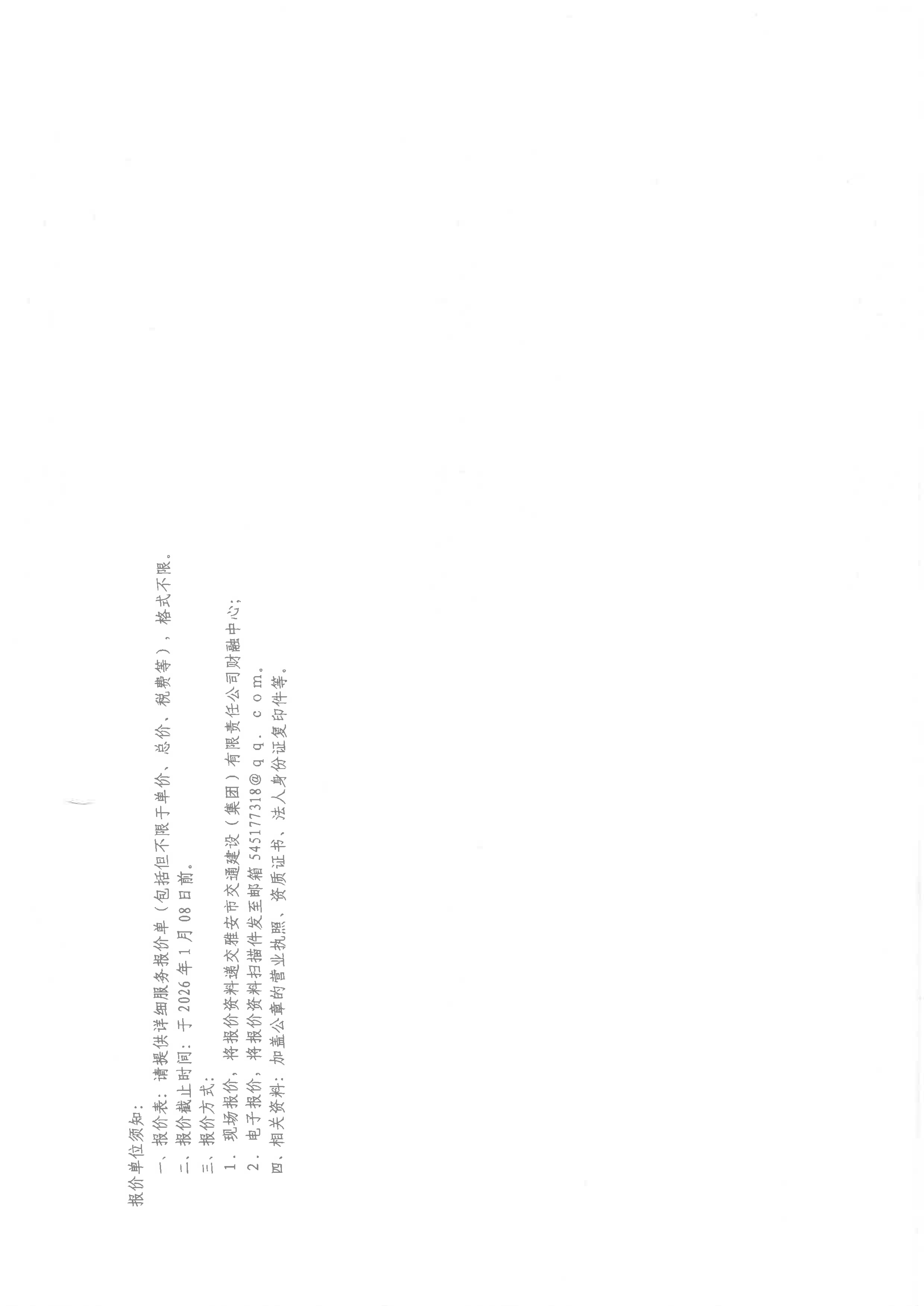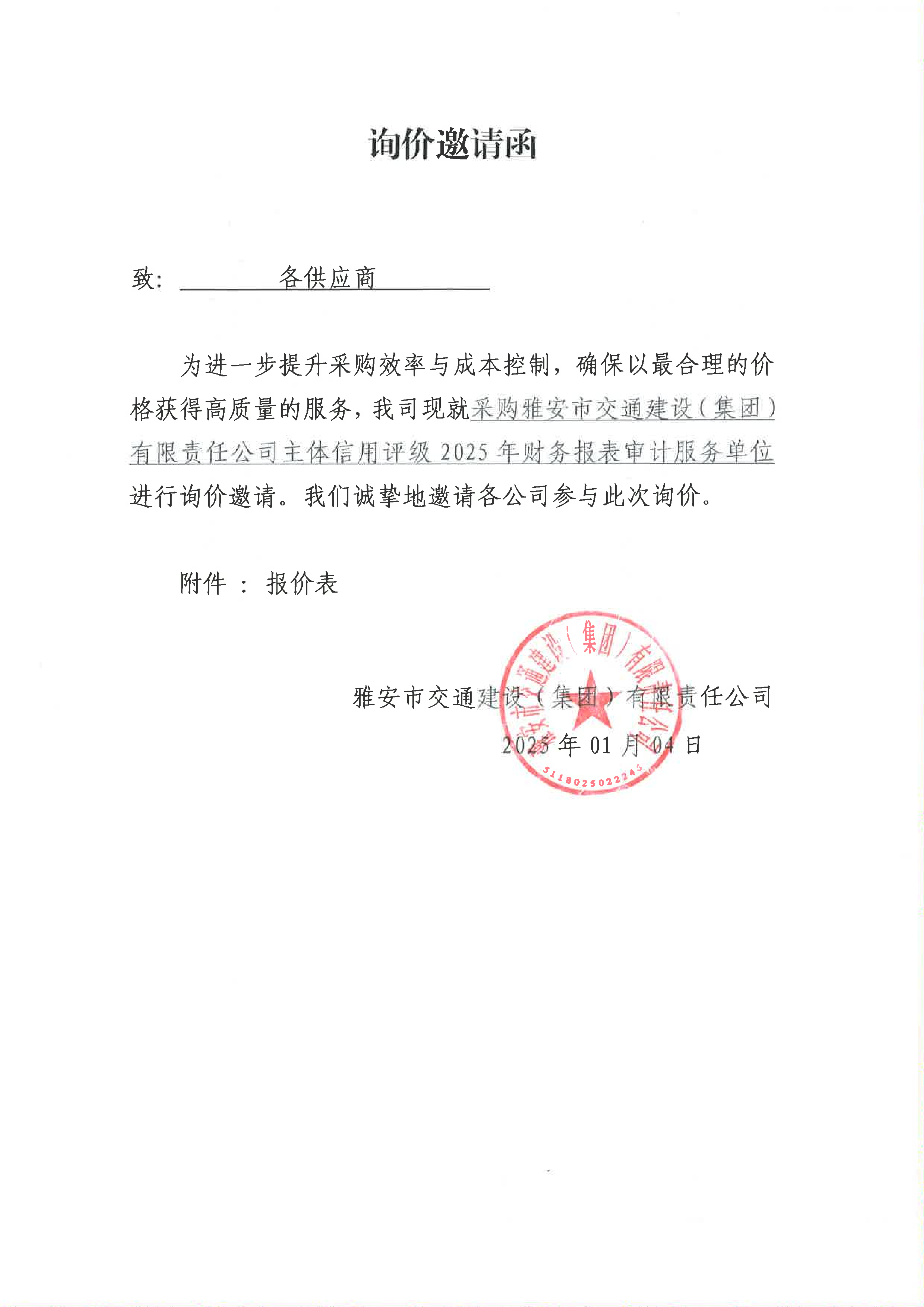 關(guān)于采購雅安市交通建設(shè)(集團(tuán))有限責(zé)任公司主體信用評級2025年財(cái)務(wù)報(bào)表審計(jì)服務(wù)限價的詢價函