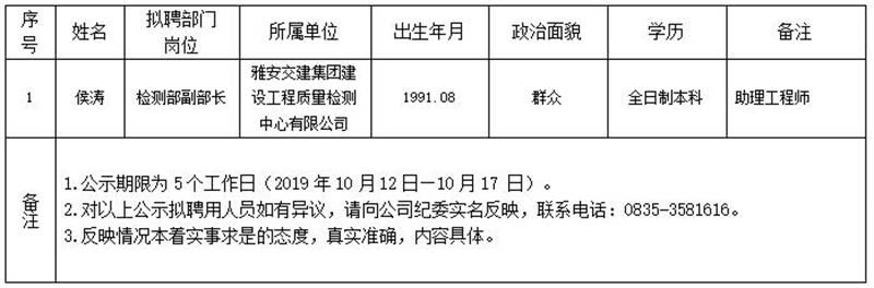 雅安交建集團(tuán)子公司擬聘用人員公示(工程質(zhì)量檢測(cè)中心)