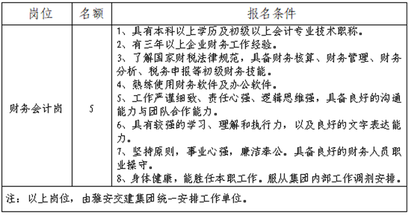 雅安市交通建設(shè)(集團(tuán))有限責(zé)任公司所屬子公司財務(wù)人員招聘公告