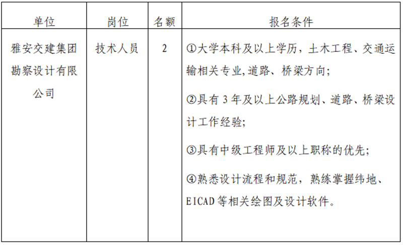 根據(jù)發(fā)展需要,決定面向社會(huì)公開招聘雅安市交通建設(shè)(集團(tuán))有限責(zé)任公司(以下簡稱“雅安交建集團(tuán)”)所屬子公司工作人員2名,現(xiàn)將有關(guān)事項(xiàng)公告如下: